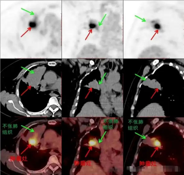 PET/CT能对肺癌放疗靶区的勾画提供参考,尤其适用于肺癌合并阻塞性肺炎或肺不张的患者,通过PET/CT提供的代谢信息可以明确肿瘤灶的实际范围,避免非肿瘤组织或正常组织的额外照射,减少放射性肺炎的发生率。