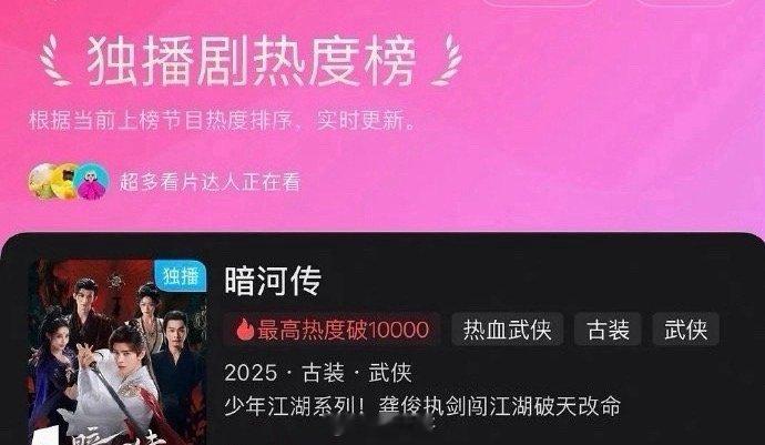 龚俊暗河传优酷独播剧热度榜TOP1又一次被龚俊《暗河传》的长尾效应惊艳到了啊,龚俊这部剧播出这么久了,居然又登顶优酷独播剧热度榜第一了,站内热度榜排在成毅《长安二十四计》之后,俊俊在这部剧的状态和演技,谁看了不心动啊~龚俊暗河传优酷热度榜第二
