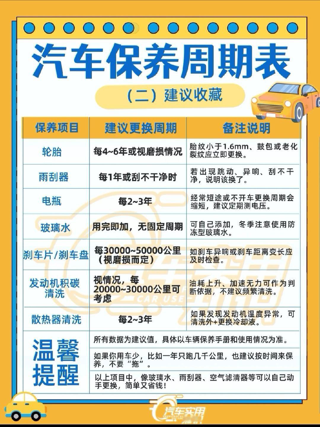 贝贝们今天我分享一些汽车实用知识特别适合:✔ 第一次买车的新手✔ 想省钱的车主✔ 想知道哪些能自己换、哪些不能拖的朋友!一些常见误区也一并提醒下:1. 机油不是开多才换,开得少也要按时间换2. 玻璃水不是水加进去就行,冬天一定要用防冻型3. 雨刮器刮不干净就别凑合用了,视线模糊很危险!别等车子出问题才想起保养这回事定期养护=省心省钱+更安全!汽车大v聊车