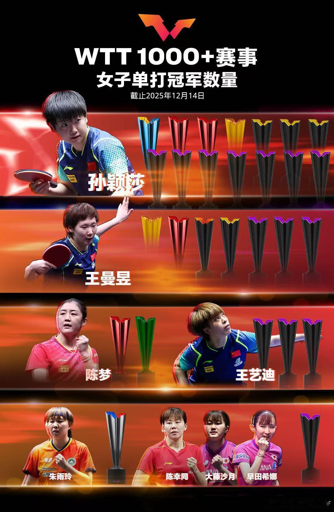wtt香港总决赛2025 WTT1000+冠军榜更新,张本智和、王曼昱各添一冠。