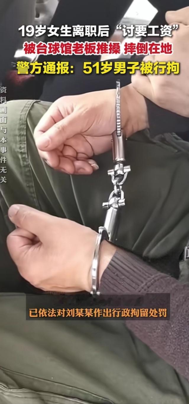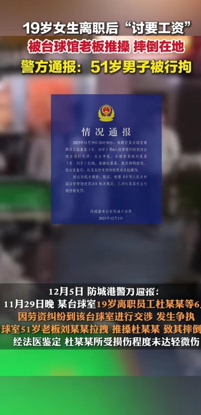 广西防城港台球厅风波:19岁讨薪女孩遭老板推搡,51岁店主被行拘 广西防城港的夜色里,一家台球厅的冲突打破了平静。2025年11月29日20时50分,19岁的离职员工杜某某带着5名前同事,为被拖欠的工资与51岁老板刘某某交涉,一场本可平和解决的劳资纠纷,最终演变成肢体冲突。 据同行者回忆,6人曾多次通过微信、电话联系刘某某对账结算,却屡遭推诿失联。当晚到场后,杜某某始终保持克制,低声询问薪资发放时间,没想到刘某某突然情绪失控,伸手揪住她的衣领猛力拉扯,随后粗暴推搡。监控画面显示,杜某某踉跄后退,重重摔在台球桌旁的地板上,手肘和膝盖擦出红痕,离楼梯口仅半步之遥,险些坠楼。更令人愤慨的是,刘某某事后在工作群辱骂员工“垃圾”,甚至纵容他人附和“忘恩负义”。 尽管经法医鉴定,杜某某的挫伤未达轻微伤,但刘某某的行为已触碰法律红线。依据《中华人民共和国治安管理处罚法》,其侵犯他人人身权利的行为理应受罚,12月5日公安机关依法对其作出行政拘留决定。此前在多部门督促下,涉事台球厅已结清6人全部工资,其中杜某某被拖欠的9千余元薪资也已到账。 事件曝光后引发网友热议:“欠薪在先还动手,欺负年轻人算什么本事?”“劳动报酬是底线,暴力维权更是错上加错!” 法律从不纵容恃强凌弱,即便未造成严重伤情,公然推搡他人的行为也需承担责任。这场风波警示所有经营者,尊重劳动者权益是立身之本,劳资纠纷应通过合法途径化解,任何逾越法律边界的冲动之举,终将付出代价。你如何看待老板欠薪又动手的行为?欢迎留言讨论。台球厅被打 台球厅拖欠工资 乱打台球