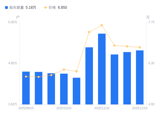 日期A股户数(户)流通A股户均持股数(股)户均持股市值(万元)2025-12-105180015467.8010.602025-11-285130015618.5610.752025-11-205060015834.6310.942025-11-105670014131.0810.742025-10-315270015203.6511.212025-10-204380018292.9711.032025-10-104500017805.1610.842025-09-304511517759.7710.482025-09-194550017609.5010.282025-09-104560017570.8810.28