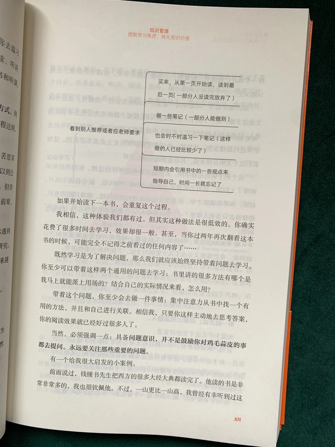用输出倒逼输入。写下来(简单做摘录,写读后感,抄书法),讲出来(调动五官读出重要内容,与朋友家人讨论新知,用自己的话复述,出声背诵),教起来(费曼学习法:选准备学习的知识,把它教给别人,在教的过程发现解决问题再教给别人),用起来。