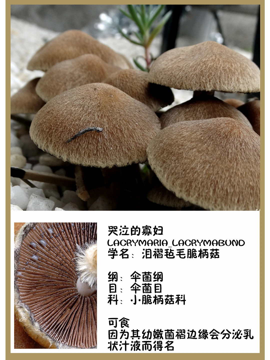 哭泣的寡妇 lacrymaria_lacrymabund 学名:泪褶毡毛脆柄菇 纲:伞菌纲 目:伞菌目 科:小脆柄菇科 图片©manatarka.org ©josef hlasek 可食[萌萌哒R] 因为其幼嫩菌褶边缘会分泌乳状汁液而得名 菌盖表面也很特别,细看会发现有毡状的绒毛[飞吻R]
