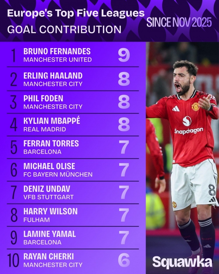 据Squawka统计,B费今年11月以来9场英超比赛参与9粒进球,五大联赛同期参与进球最多。