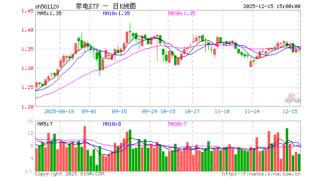 12月15日,家电ETF(561120)跌0.30%,成交额722.27万元。当日份额减少150.00万份,最新份额为7015.99万份,近20个交易日份额减少1800.00万份。最新资产净值计算值为9438.61万元。