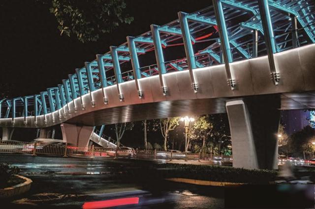 夜幕下,人民路龙湖公园过街天桥在灯光映衬下,宛若玉带横波,为城市增添了现代气息与艺术韵味,成为市民休闲观景的又一亮点。该桥的建成,有效解决了龙湖公园附近人民路南北两侧行人与非机动车的过街问题。