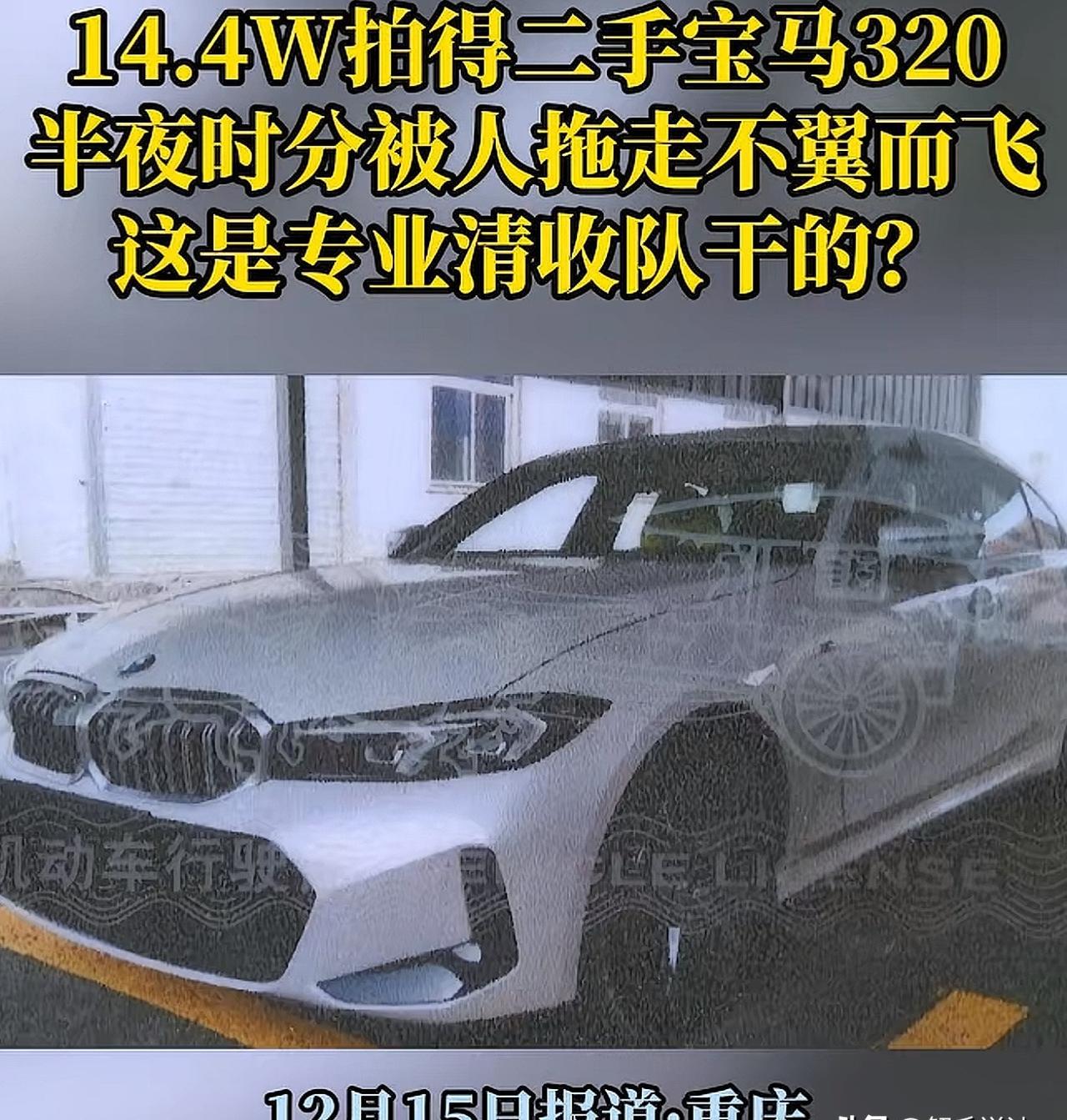 14万拍宝马到手即被盗, 四人深夜拖车, 原车主真没份? 重庆有个开二手车行的黄先生,今年10月底在法院网站看到一辆2023款宝马320拍卖,起拍价14.4万。 他觉得能赚差价就去参拍,最后成功拿下。 11月11号拿到法院文件后第三天,他找板车把车拖回自家停车场。 因为没钥匙,他联系4S店配钥匙,还跑去车管所办过户。 但那天办事大厅人太多,他只办了两个流程,就把车停回车库。 没想到周日再去查看时,那辆宝马直接消失了。 调监控发现,当晚有四个人开皮卡车进来,把宝马直接拖走了。 黄先生觉得是原车主欠债被逼的,就去找原车主问,原车主不承认,法院也说不清楚。 最后他只能报警,警察调查到车子最后出现在弹子石附近,现在还没找到。 目前案子在查,车还没下落,钱也不知道能不能要回来。