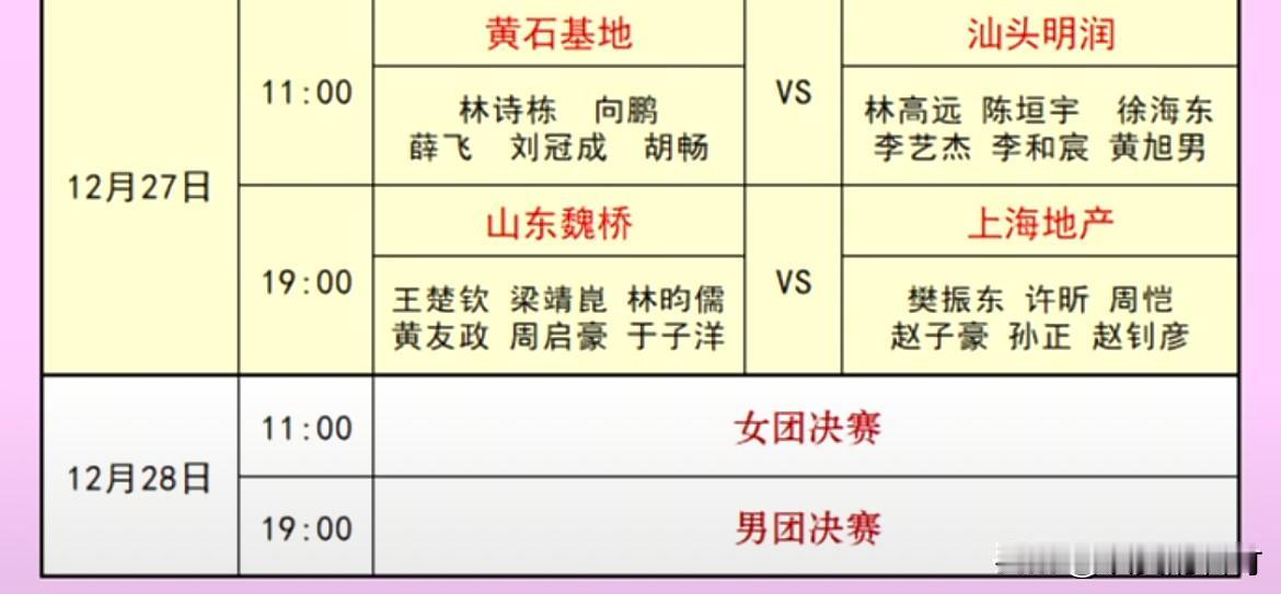 林诗栋对阵林高远王楚钦对阵樊振东 12月27日乒超联赛男团半决赛 1、黄石基地对阵汕头明润 黄石基地有 林诗栋、向鹏、薛飞 汕头明润有 林高远、徐海东、陈垣宇 感觉黄石基地会赢。晋级决赛。 林高远打不过林诗栋。 黄石基地很幸运。对阵汕头明润。比较好打。 2、山东魏桥对阵上海地产 山东魏桥有 王楚钦、梁靖崑、黄友政、周启豪 上海地产有 樊振东、许昕、周凯、赵子豪 如果王楚钦因伤缺席,那么上海地产就会赢,晋级决赛。 如果王楚钦参加半决赛,那么有可能山东魏桥赢。晋级决赛。