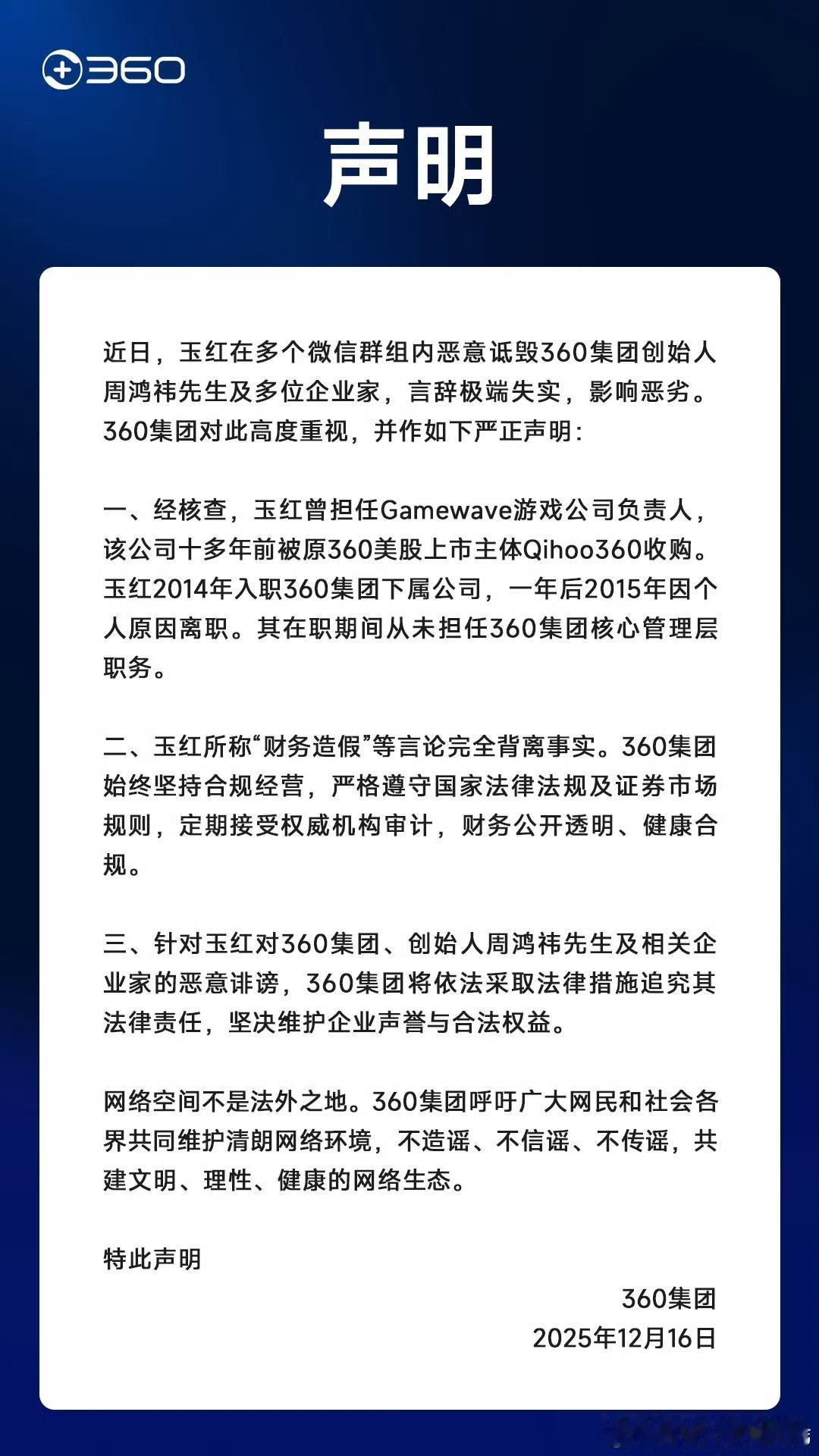 360集团前高管玉红在社交平台爆料,直指董事长周鸿祎涉嫌财务造假,涉及金额高达数十亿元。这一重磅指控立即引发市场震荡,360股价应声下跌超5%。面对舆论风波,周鸿祎迅速回应,严词否认造假指控,并表示已启动法律程序维权。