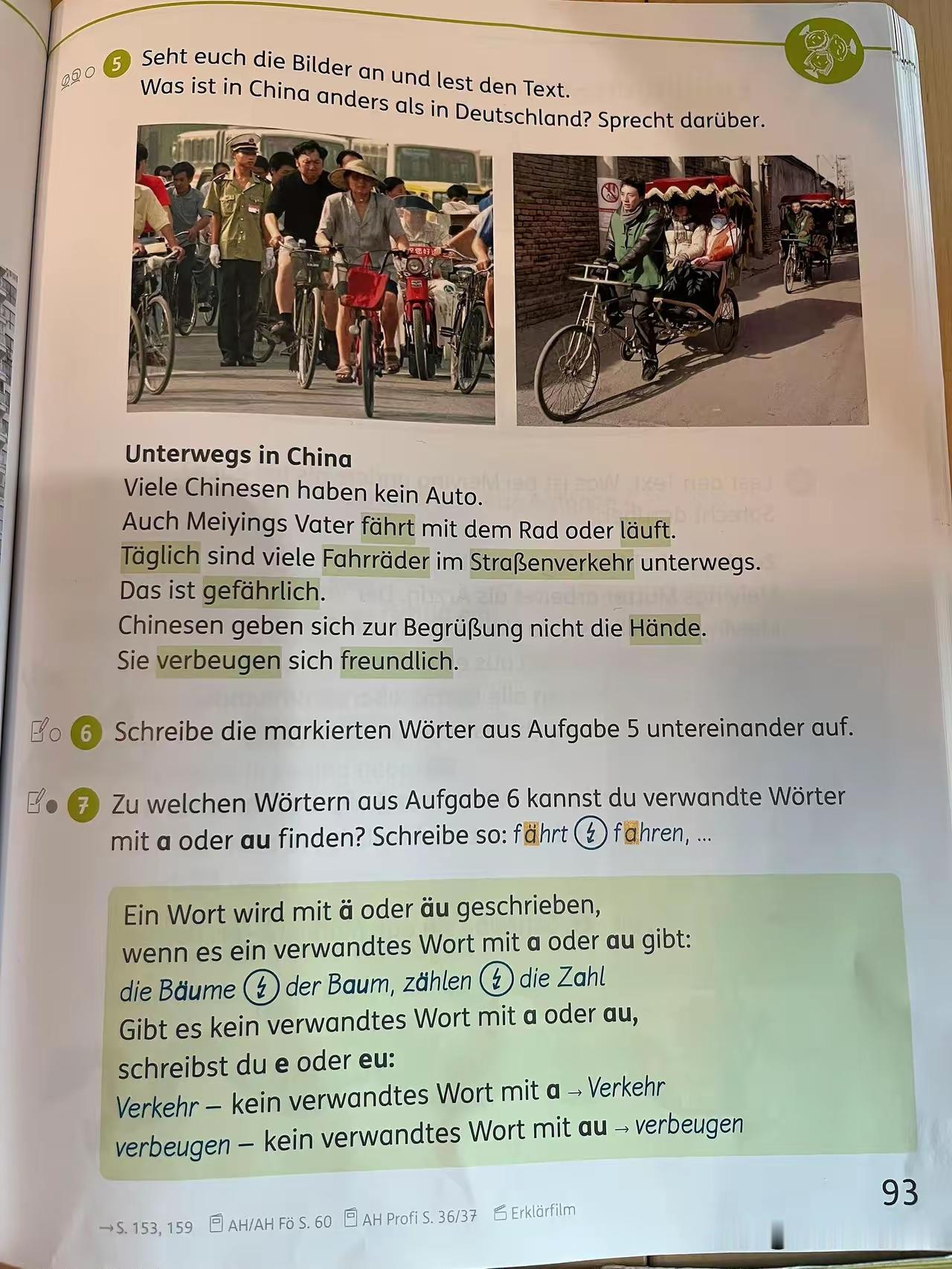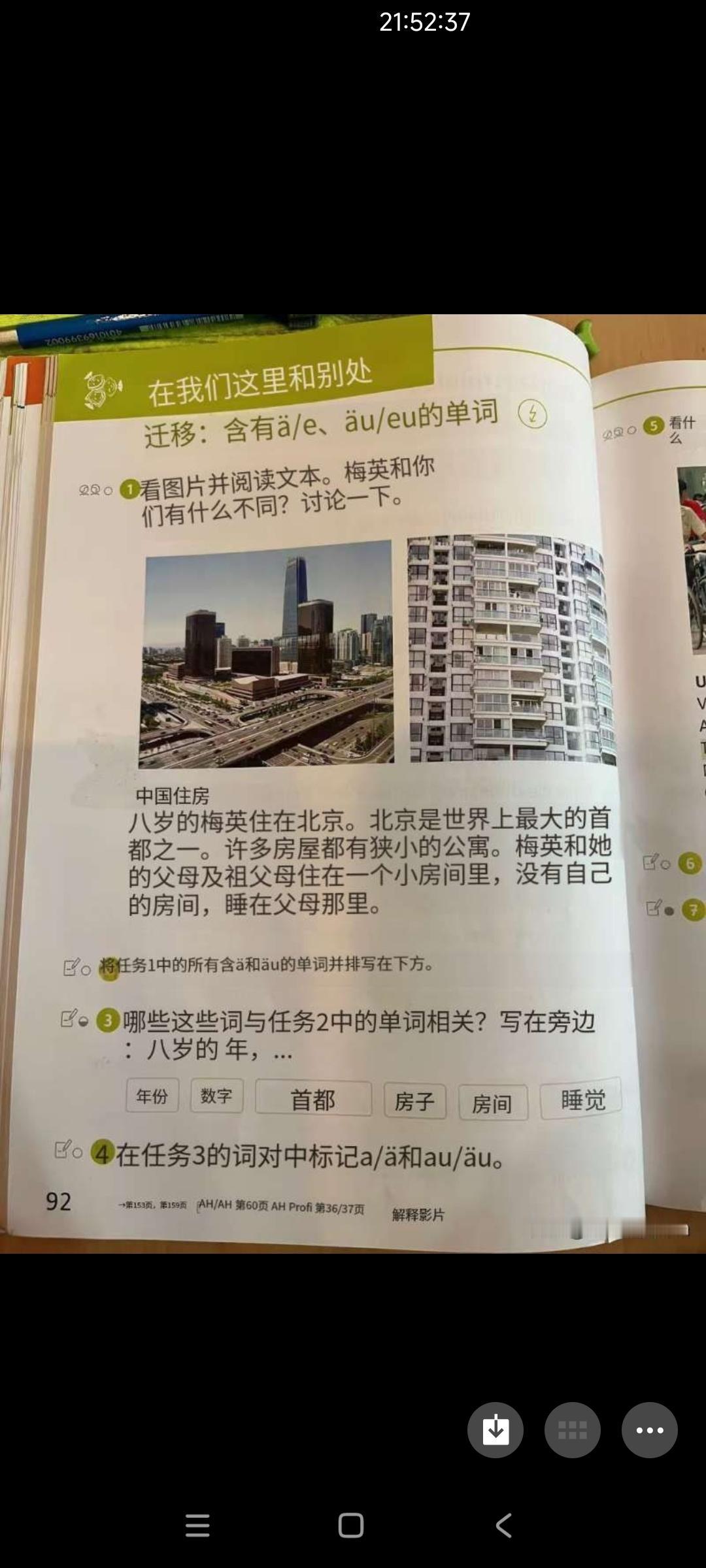 天哪!德国二年级课本里是这样描述现在中国的! 德国的课文里说中国人没有房子可以住,一家三代六七口人挤在一个狭小的公寓里。 德国的课文里说许多中国人没有汽车,需要靠自行车出行,见人就鞠躬! 课文里的配图都是八十年代的老照片。 德国的小孩子看到这样的课文,会从小就认为中国是一个贫穷落后的国家。 课文里的介绍会让德国小孩对中国产生错误言论认知! 不敢面对现实的国家是没有未来的!