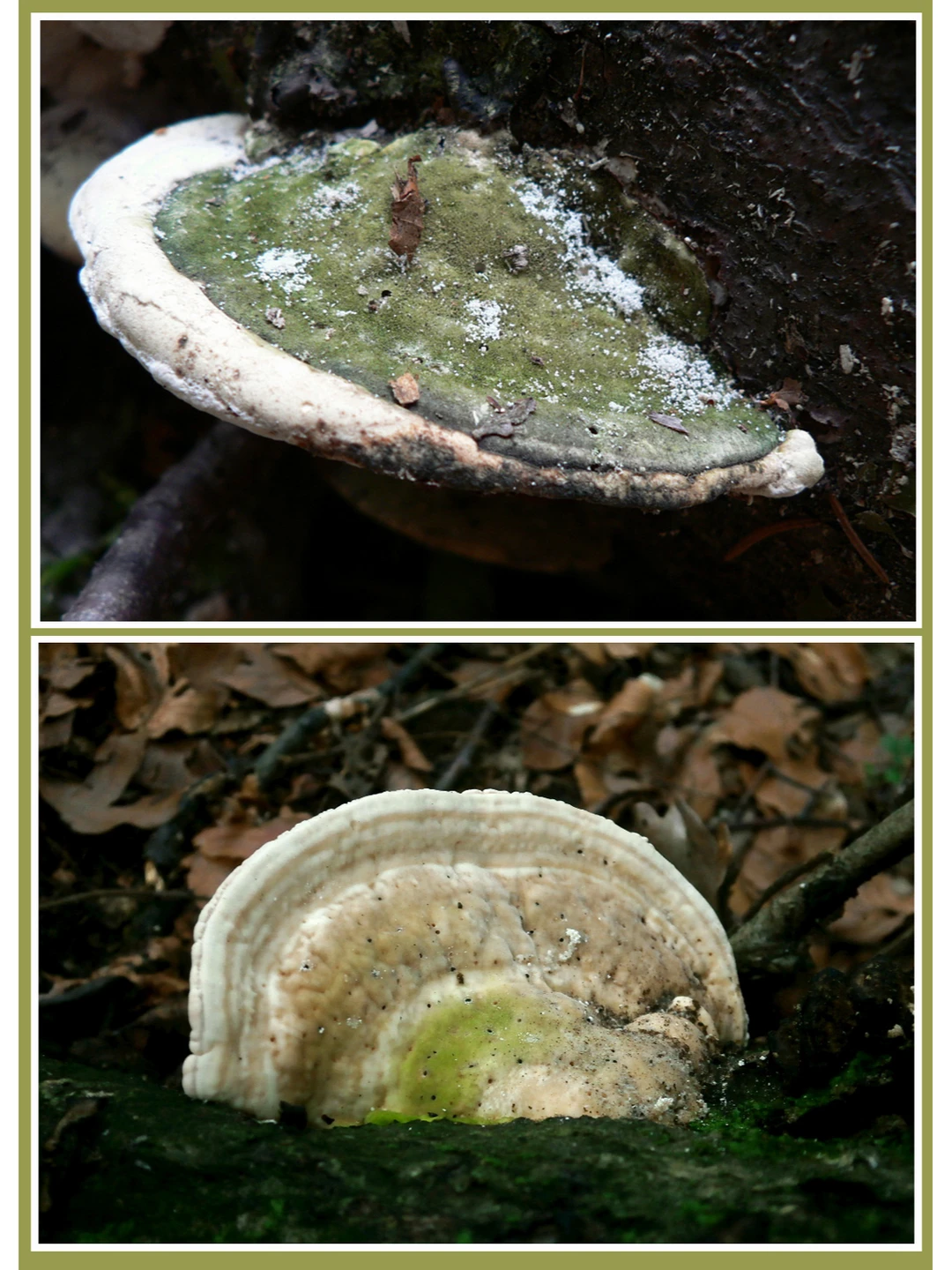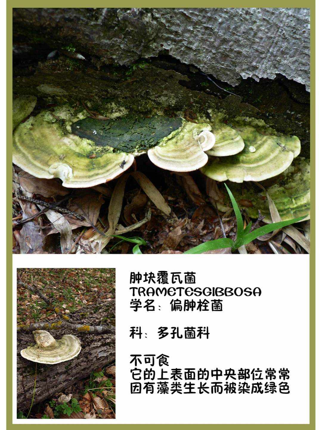 肿块覆瓦菌 Trametesgibbosa 学名:偏肿栓菌 科:多孔菌科 图片©manatarka.org ©josef hlasek 不可食 它的上表面的中央部位常常因有藻类生长而被染成绿色