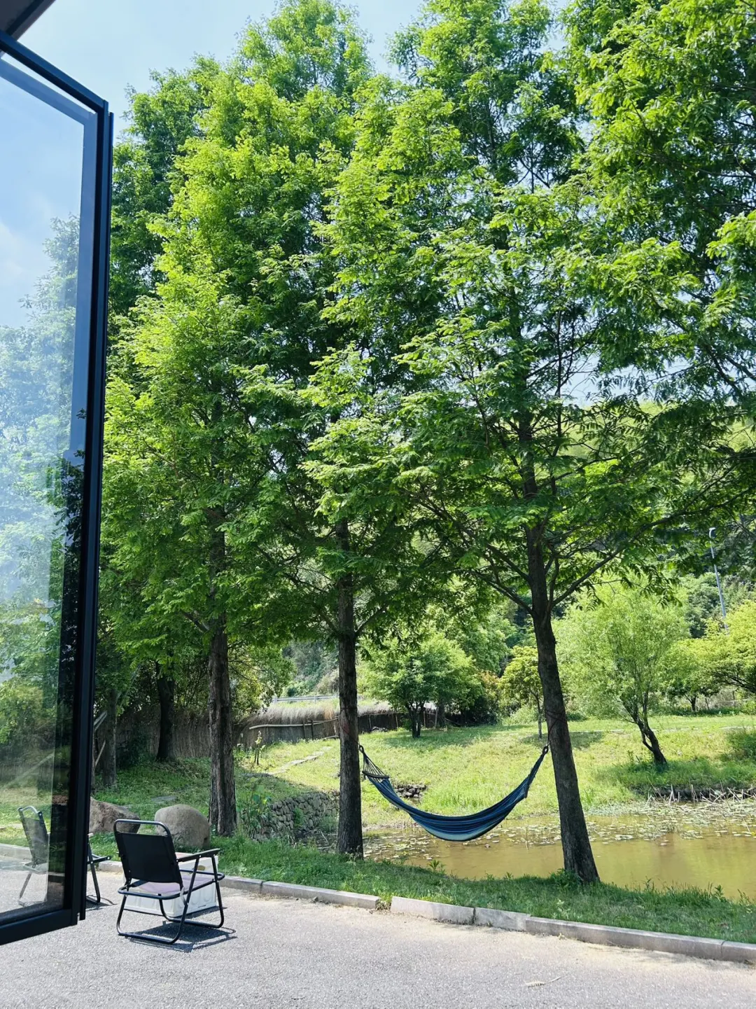 穿过隧道,眼前是一片绿油油的田野,满眼的绿色特别治愈。一亩咖啡就坐落在田野上。它紧邻小溪,背靠山峦,坐拥了一个满是草坪的院子🌈仿佛进入了一个“公园里”。