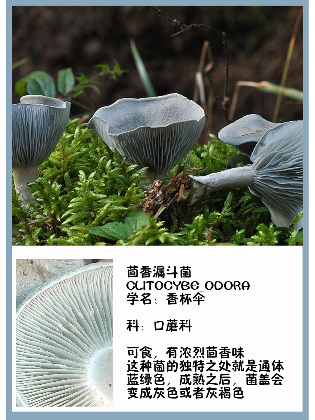 茴香漏斗菌 clitocybe_odora_ 学名:香杯伞 科:口蘑科 图片©manatarka.org ©josef hlasek 可食,有浓烈茴香味 这种菌的独特之处就是通体蓝绿色,成熟之后,菌盖会变成灰色或者灰褐色