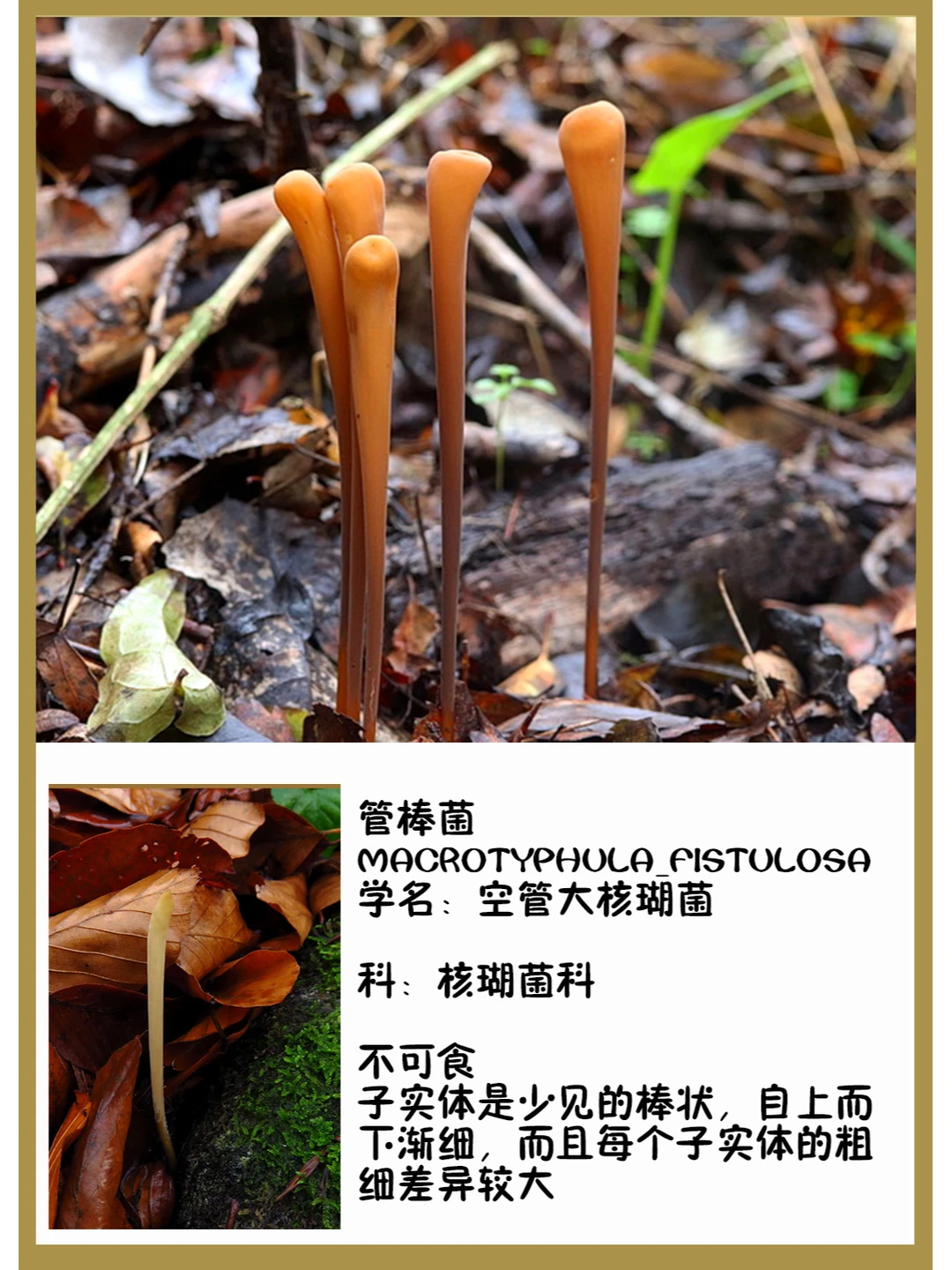 管棒菌 macrotyphula_fistulosa 学名:空管大核瑚菌 科:核瑚菌科 图片©manatarka.org ©josef hlasek 不可食 子实体是少见的棒状,自上而下渐细,而且每个子实体的粗细差异较大 该菌常常因为隐没于林中地面而被忽视,但是一旦发现就是一大片[萌萌哒R]