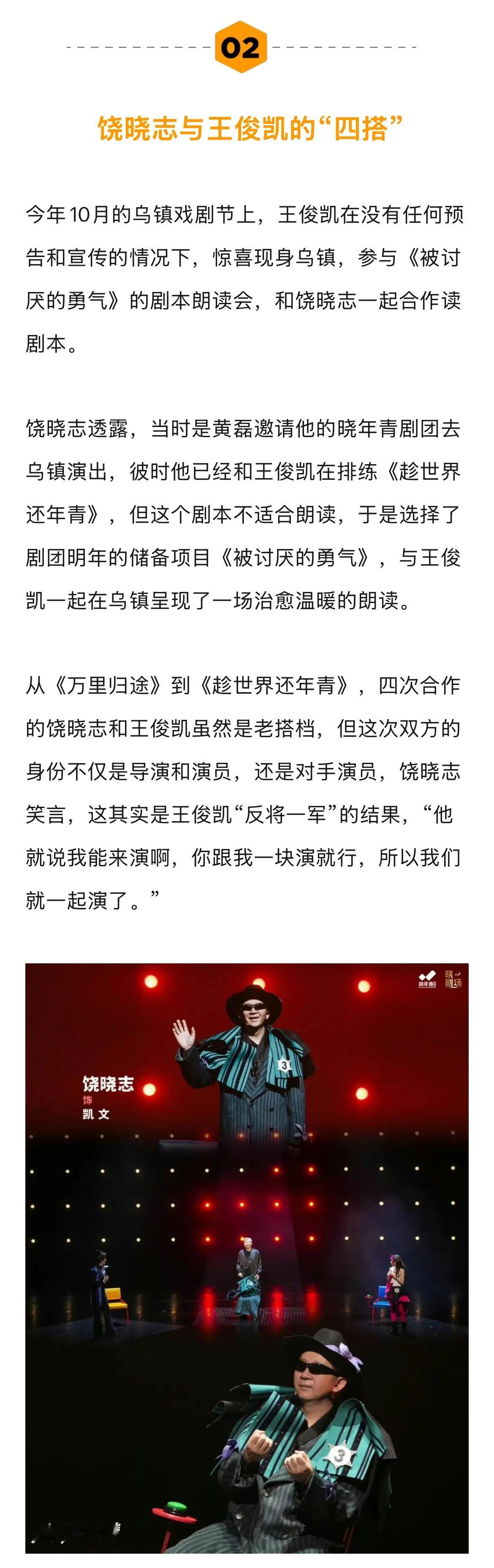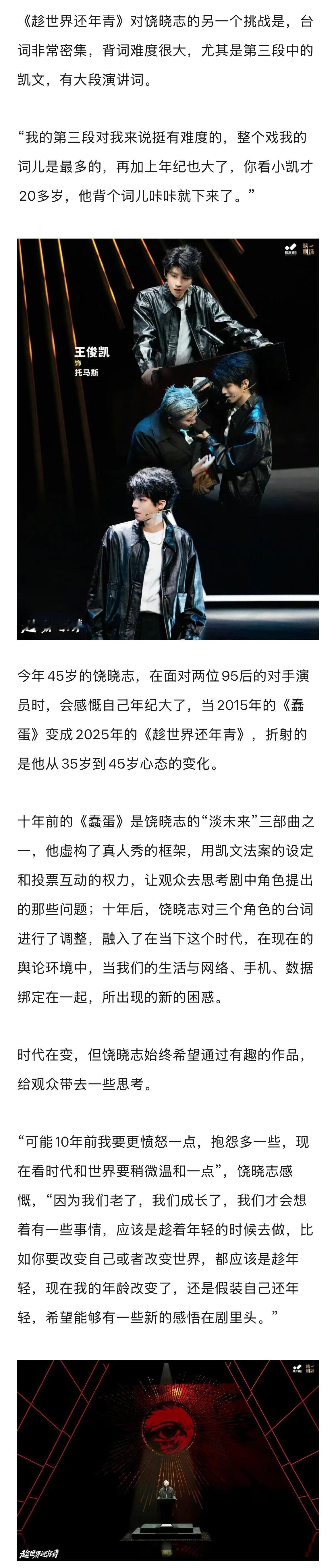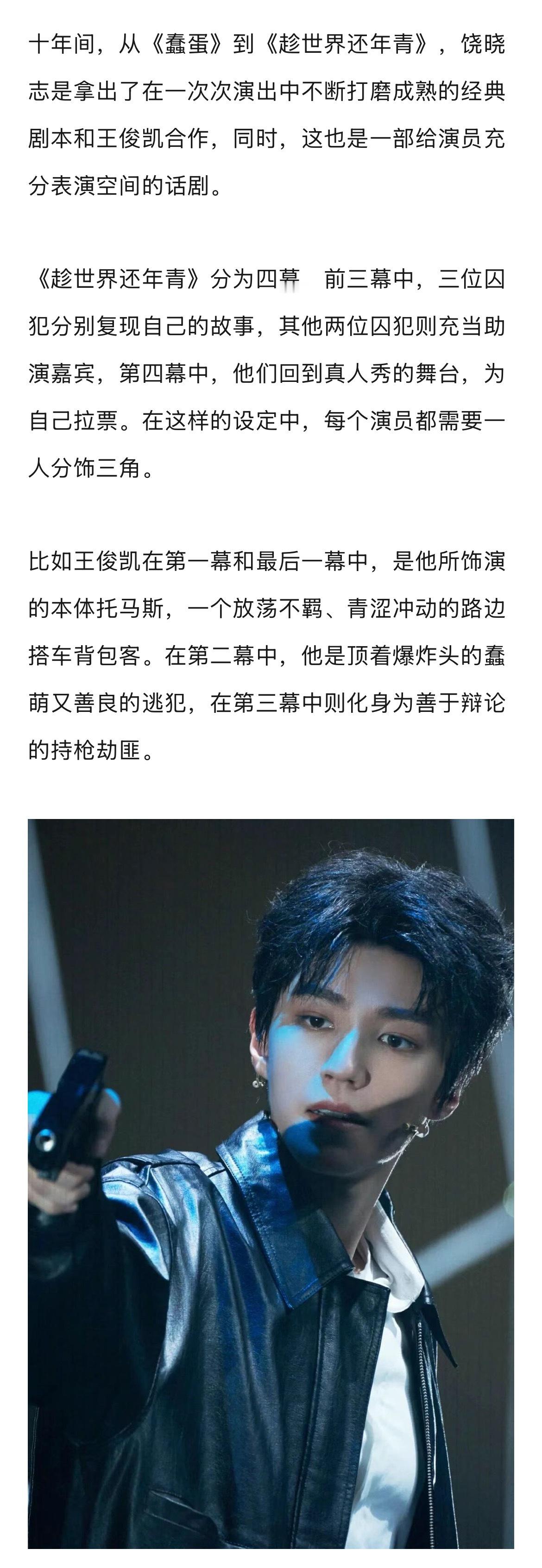 饶晓志说王俊凯演戏没有杂念饶晓志说王俊凯背词特别快 《趁世界还年青》分为四幕,前三幕中,三位囚犯分别复现自己的故事,其他两位囚犯则充当助演嘉宾,第四幕中,他们回到真人秀的舞台,为自己拉票。在这样的设定中,每个演员都需要一人分饰三角。比如王俊凯在第一幕和最后一幕中,是他所饰演的本体托马斯,一个放荡不羁、青涩冲动的路边搭车背包客。在第二幕中,他是顶着爆炸头的蠢萌又善良的逃犯,在第三幕中则化身为善于辩论的持枪劫匪。饶晓志透露,他当时也建议王俊凯考虑选择这个剧本,“因为有挑战,从我们演的过瘾的角度来说,你还可以一人分饰几角,我也希望很多人能看到小凯的不一样。”从《万里归途》到《趁世界还年青》,四次合作的饶晓志和王俊凯虽然是老搭档,但这次双方的身份不仅是导演和演员,还是对手演员,饶晓志笑言,这其实是王俊凯“反将一军”的结果,“他就说我能来演啊,你跟我一块演就行,所以我们就一起演了。”对于王俊凯的这次完全解放天性,饶晓志表示:“他没有杂念,他是个职业的演员。”《趁世界还年青》对饶晓志的另一个挑战是,台词非常密集,背词难度很大,尤其是第三段中的凯文,有大段演讲词。“我的第三段对我来说挺有难度的,整个戏我的词儿是最多的,再加上年纪也大了,你看小凯才20多岁,他背个词儿咔咔就下来了。”在《趁世界还年青》散场后,新浪娱乐工作室注意到,身边的观众不仅在跟场外的朋友激动地分享王俊凯演得有多好、角色有多么百变,也有很多人提到了剧本本身的深度、话剧舞台舞美的震撼和多媒体手段的有趣。的确,当明星演员引领新观众进场,肯定会给一些人埋下一颗戏剧的种子。娱理独家↓