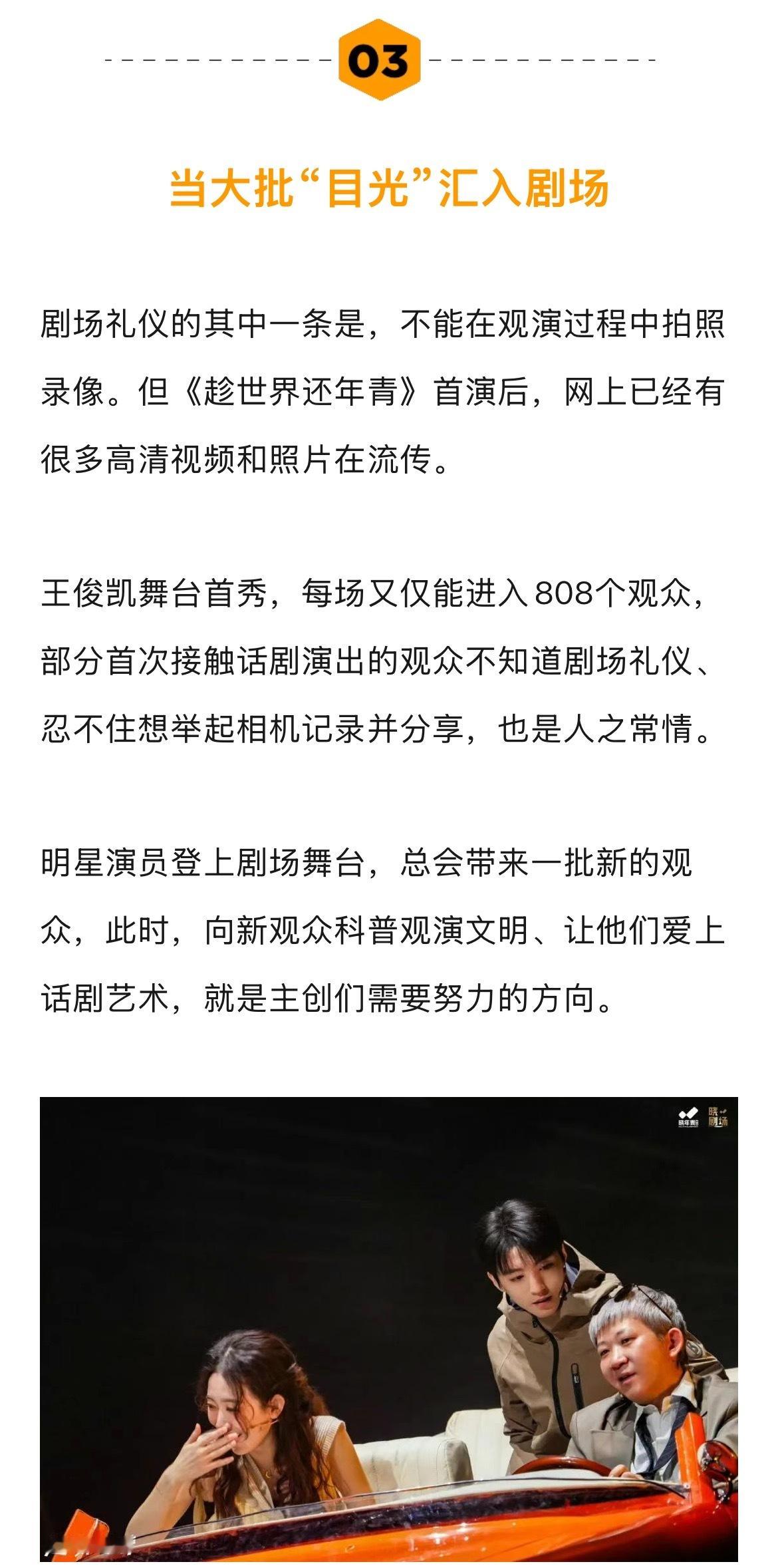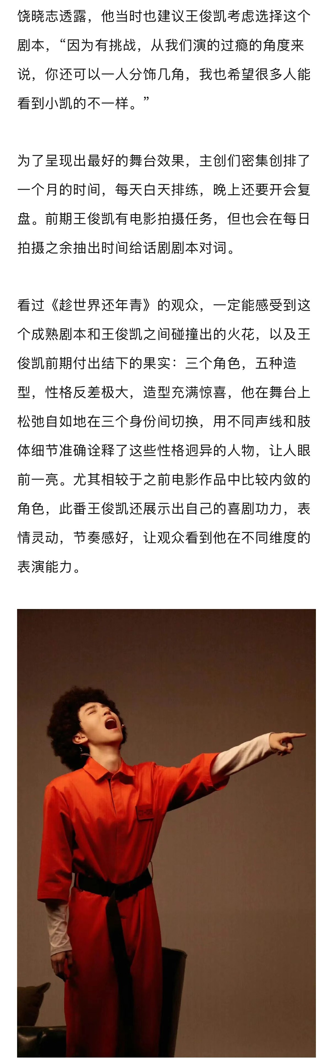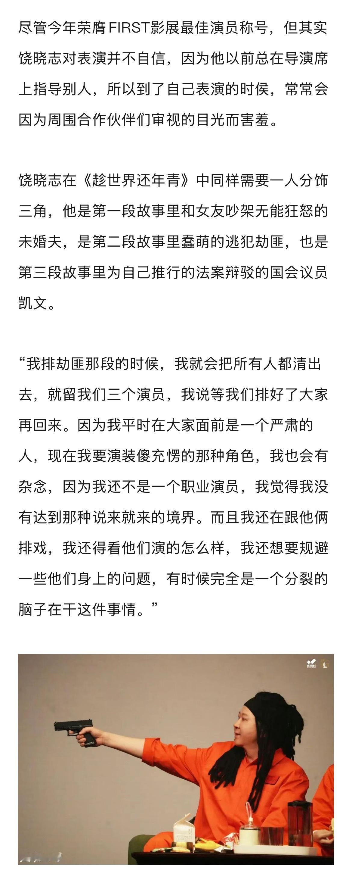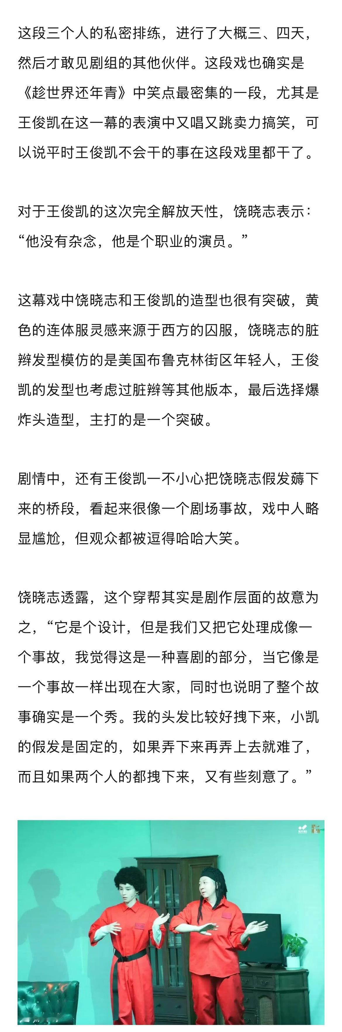 饶晓志说王俊凯演戏没有杂念饶晓志说王俊凯背词特别快 《趁世界还年青》分为四幕,前三幕中,三位囚犯分别复现自己的故事,其他两位囚犯则充当助演嘉宾,第四幕中,他们回到真人秀的舞台,为自己拉票。在这样的设定中,每个演员都需要一人分饰三角。比如王俊凯在第一幕和最后一幕中,是他所饰演的本体托马斯,一个放荡不羁、青涩冲动的路边搭车背包客。在第二幕中,他是顶着爆炸头的蠢萌又善良的逃犯,在第三幕中则化身为善于辩论的持枪劫匪。饶晓志透露,他当时也建议王俊凯考虑选择这个剧本,“因为有挑战,从我们演的过瘾的角度来说,你还可以一人分饰几角,我也希望很多人能看到小凯的不一样。”从《万里归途》到《趁世界还年青》,四次合作的饶晓志和王俊凯虽然是老搭档,但这次双方的身份不仅是导演和演员,还是对手演员,饶晓志笑言,这其实是王俊凯“反将一军”的结果,“他就说我能来演啊,你跟我一块演就行,所以我们就一起演了。”对于王俊凯的这次完全解放天性,饶晓志表示:“他没有杂念,他是个职业的演员。”《趁世界还年青》对饶晓志的另一个挑战是,台词非常密集,背词难度很大,尤其是第三段中的凯文,有大段演讲词。“我的第三段对我来说挺有难度的,整个戏我的词儿是最多的,再加上年纪也大了,你看小凯才20多岁,他背个词儿咔咔就下来了。”在《趁世界还年青》散场后,新浪娱乐工作室注意到,身边的观众不仅在跟场外的朋友激动地分享王俊凯演得有多好、角色有多么百变,也有很多人提到了剧本本身的深度、话剧舞台舞美的震撼和多媒体手段的有趣。的确,当明星演员引领新观众进场,肯定会给一些人埋下一颗戏剧的种子。娱理独家↓