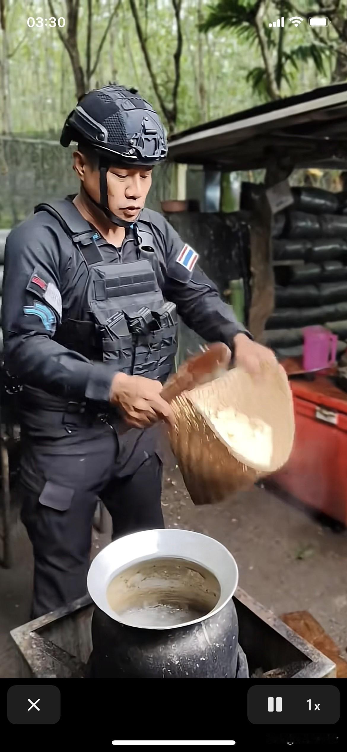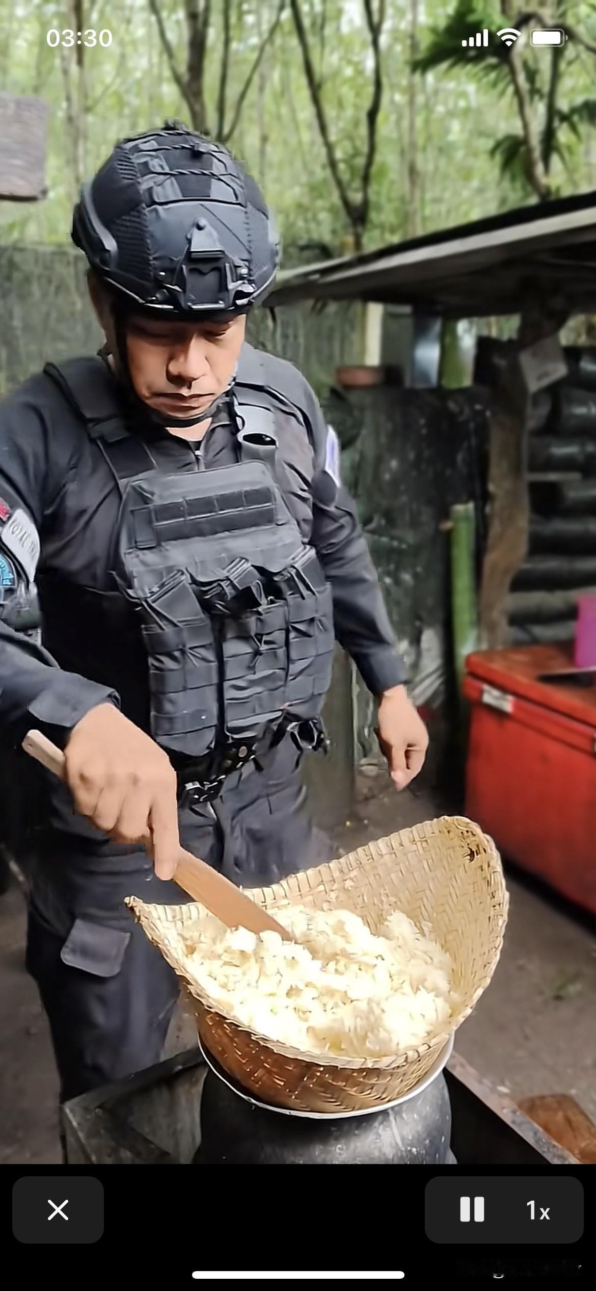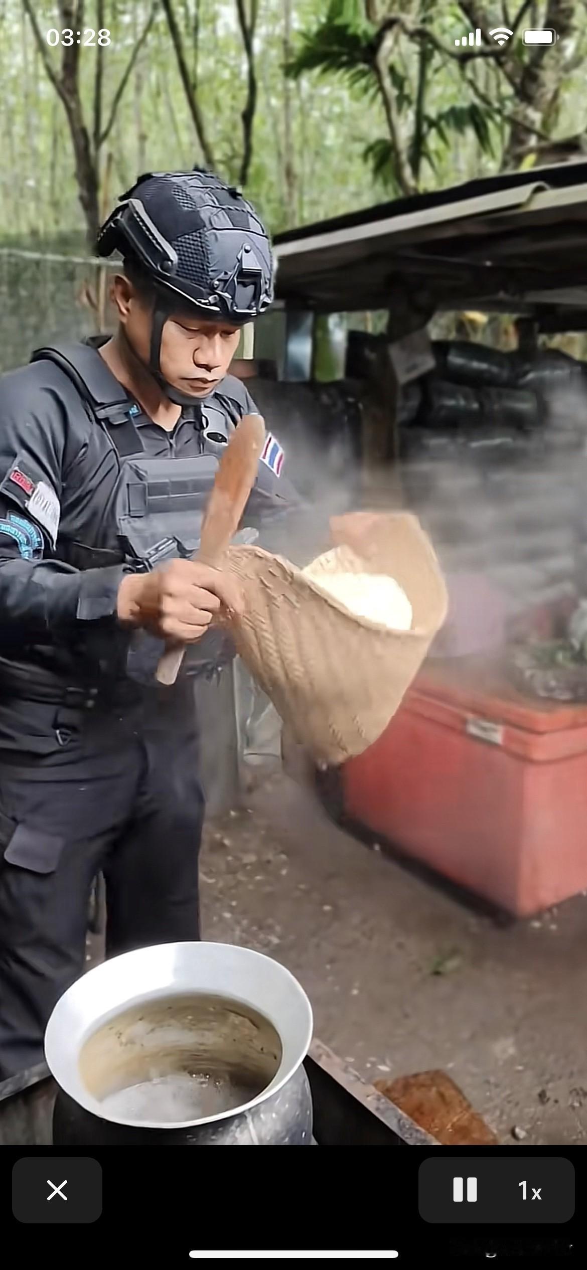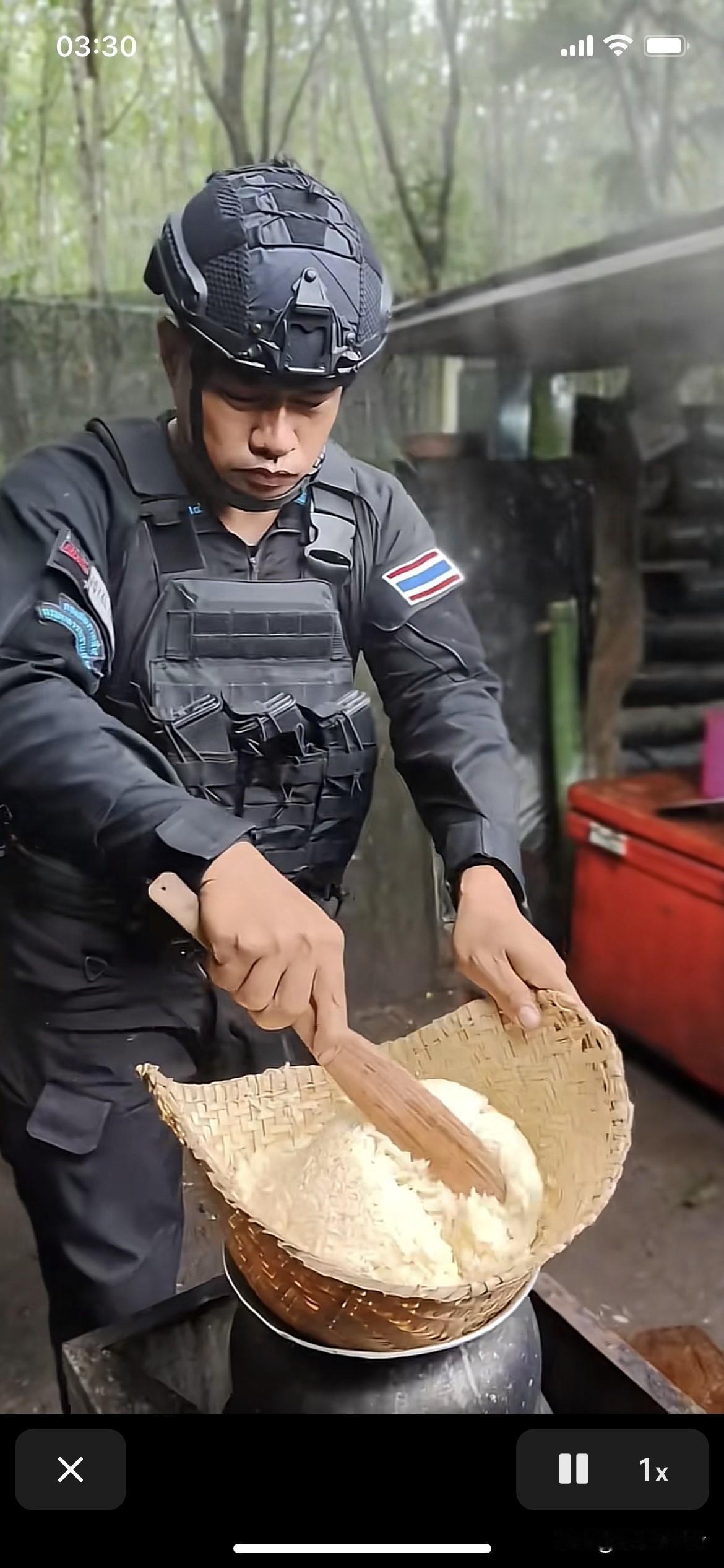 泰国军人在做糯米饭。一个锅。锅里是开水,锅上放一个草编的兜。兜里是糯米。煮一段时间,他拿起草兜,颠了几下,把糯米饭翻个,在接着煮。煮熟了,吃的时候,把糯米粉捏成小团,沾菜吃。 东南亚人 好像都爱吃 糯米饭[捂脸] 咱们云南的傣族人也吃糯米饭。 这是蒸糯米饭 那边包括老挝都是这种方式煮米饭的。和我们不一样。能煮熟吗?也没有盖子。