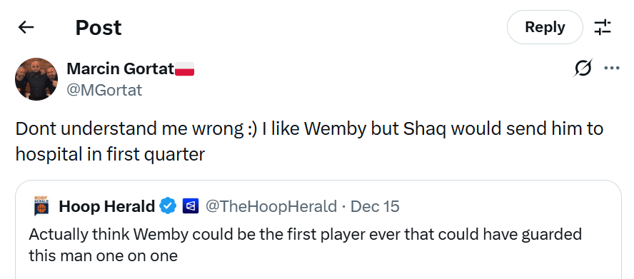 随后,前NBA球员马尔钦-戈塔特转发了这条动态并配文:我爱文班,但如果他和沙克对位,沙克用不了一节就会把他送进医院。