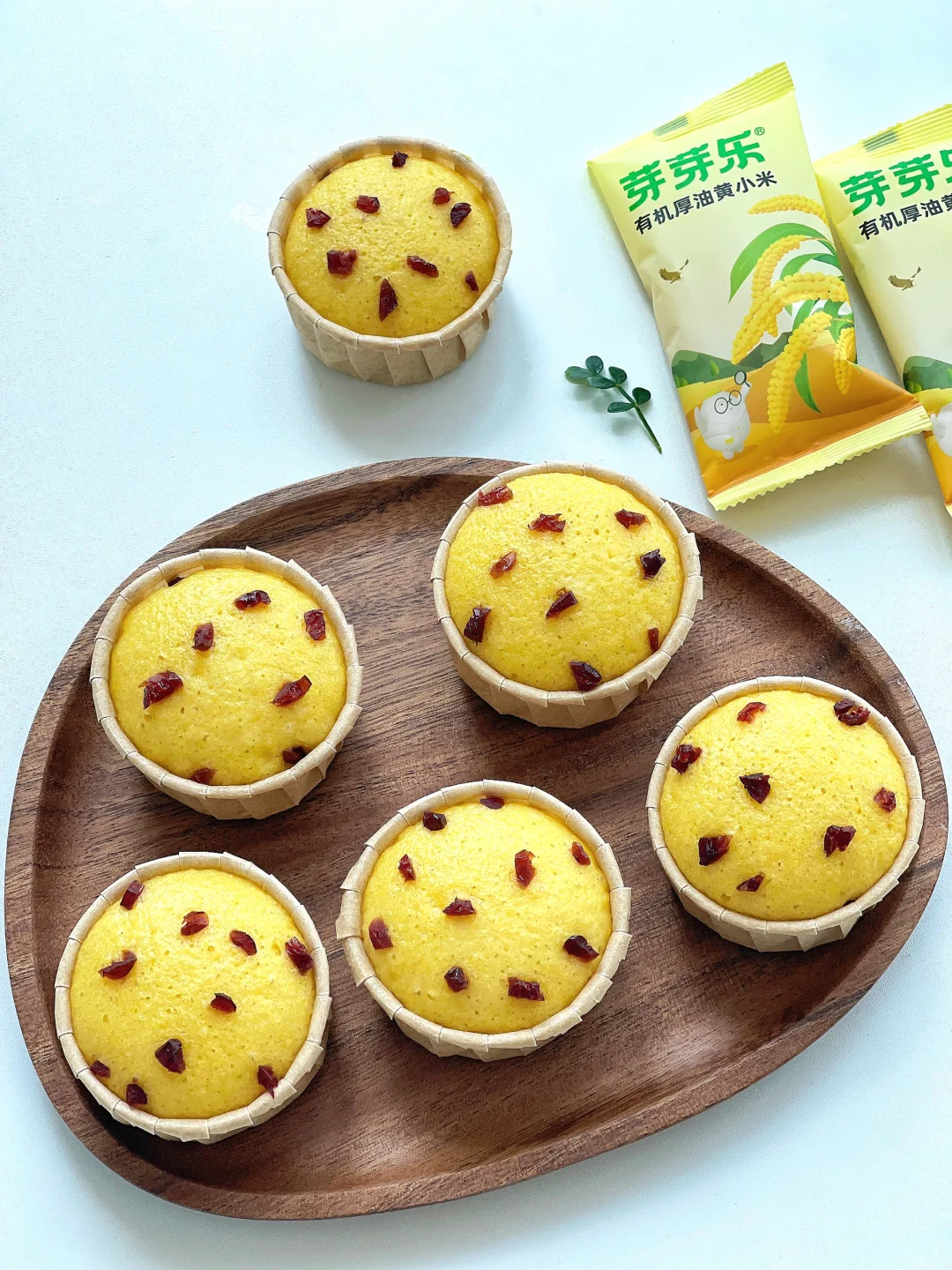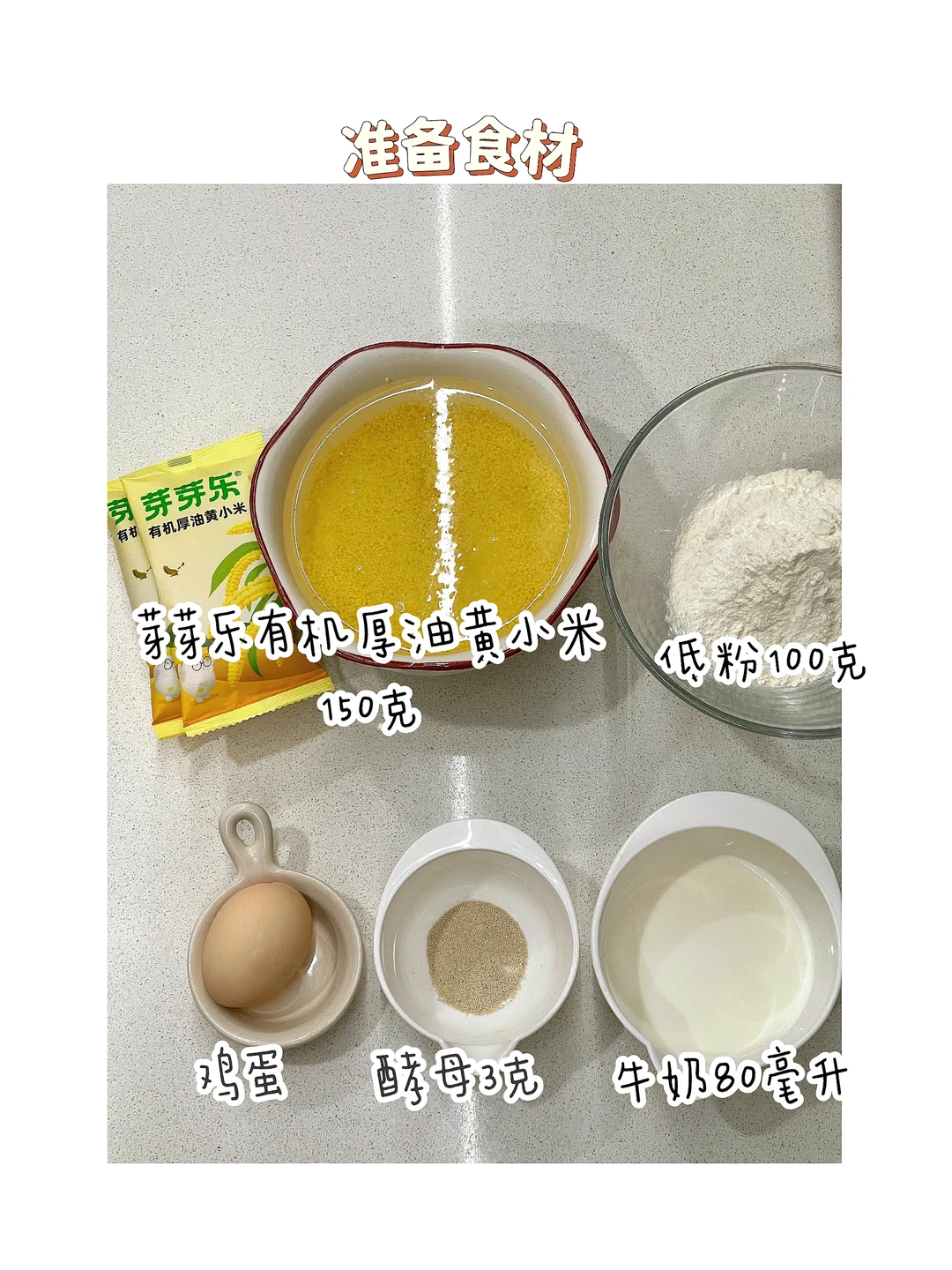✅准备食材:黄小米150克、低粉100克、鸡蛋一个、牛奶80毫升、酵母3克、蔓越莓适量.