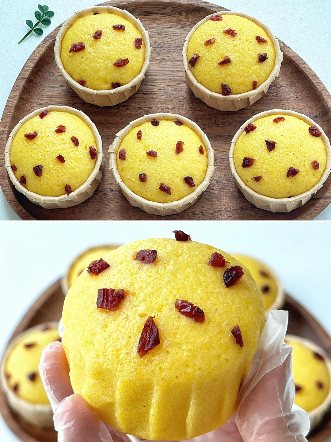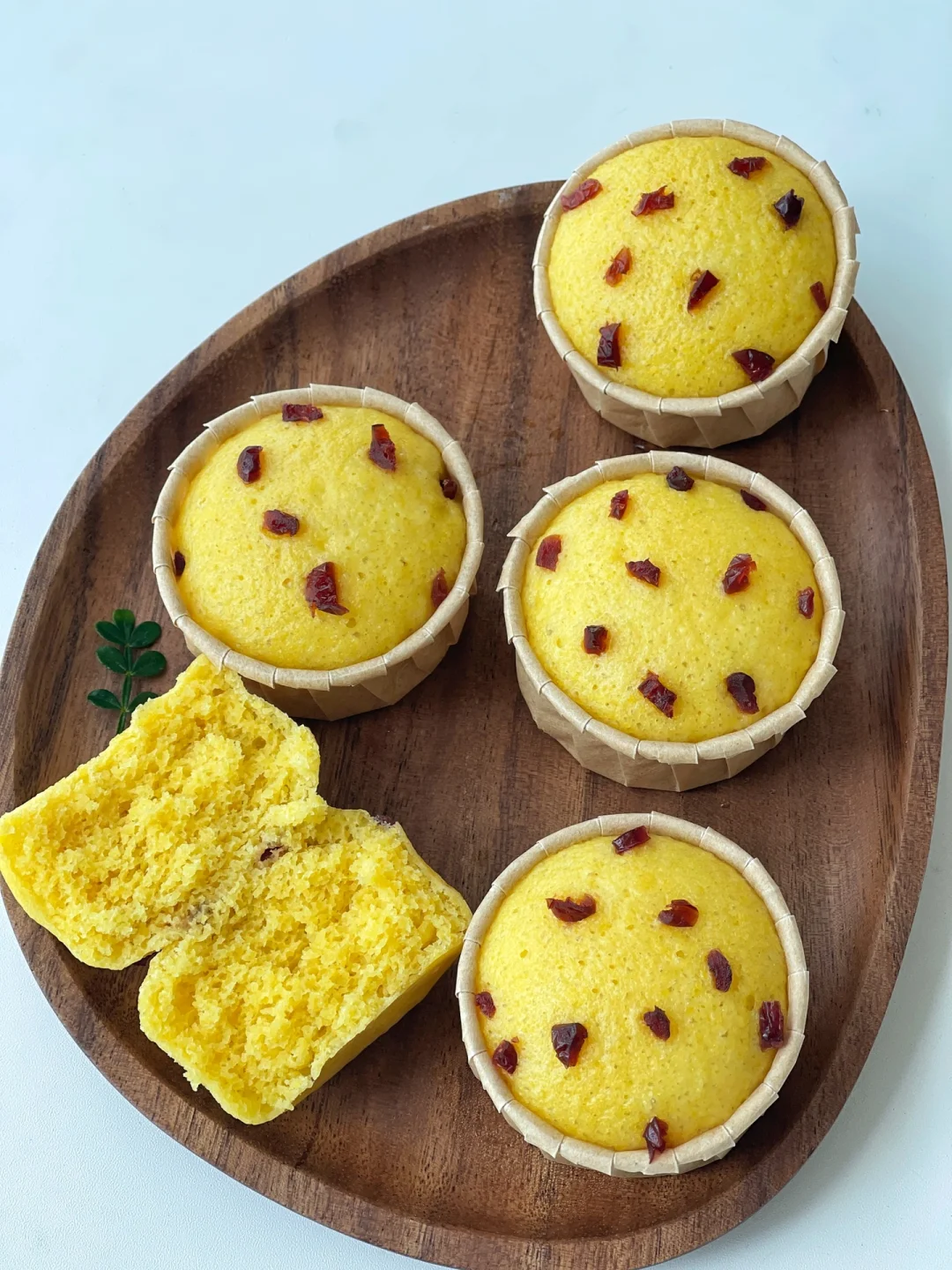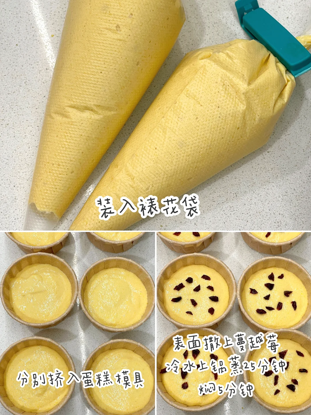 🔹加入酵母和低粉(1岁+宝宝可以加2勺糖)顺时针搅匀进行发酵。发酵至2倍大,装入裱花袋,挤入蛋糕模具,🔹表面撒上一些蔓越莓干,冷水上锅蒸25分钟,焖5分钟即可。