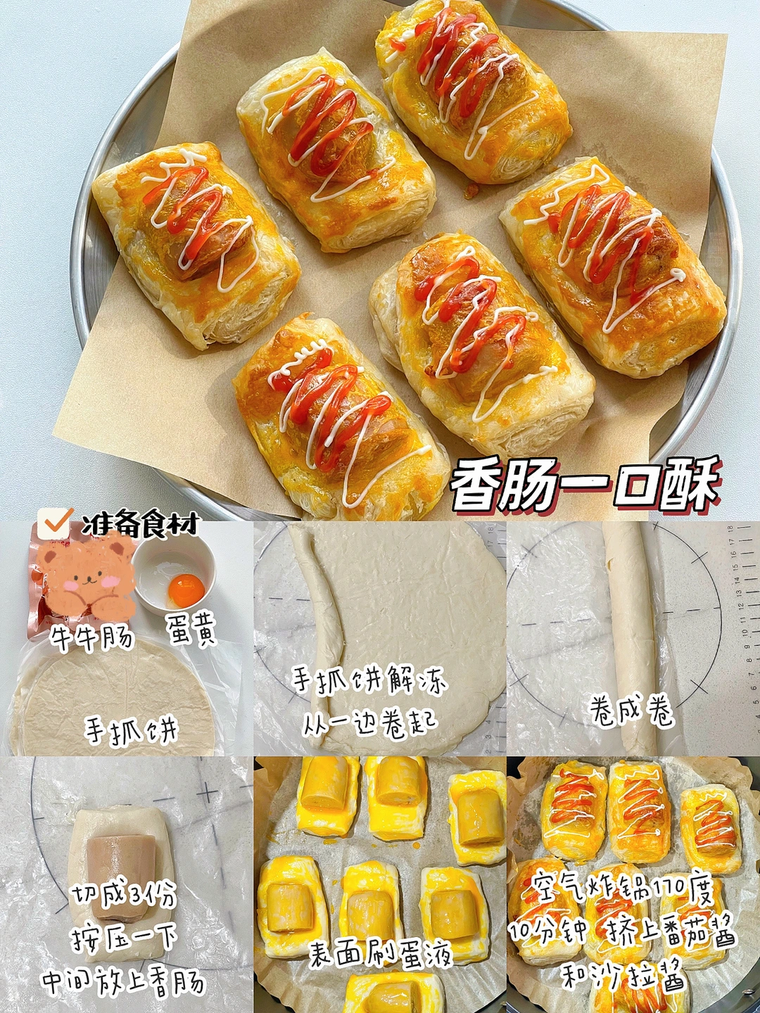 🔹制作:手抓饼解冻,卷成卷,切成香肠长短按压一下,表面放上香肠按紧,刷蛋黄液,挤上蛋黄酱和番茄酱,170度10分钟