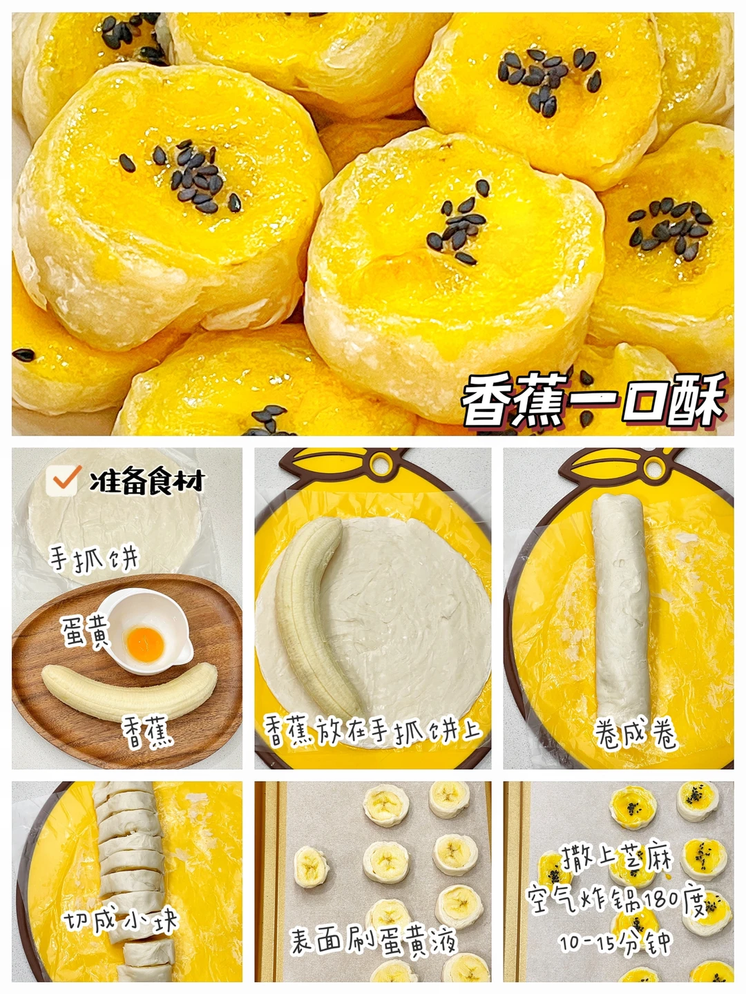 🔹制作方法:手抓饼解冻,香蕉放在手抓饼上卷成卷,切成小块表面刷蛋黄液撒黑芝麻,空气炸锅180度10~15分钟
