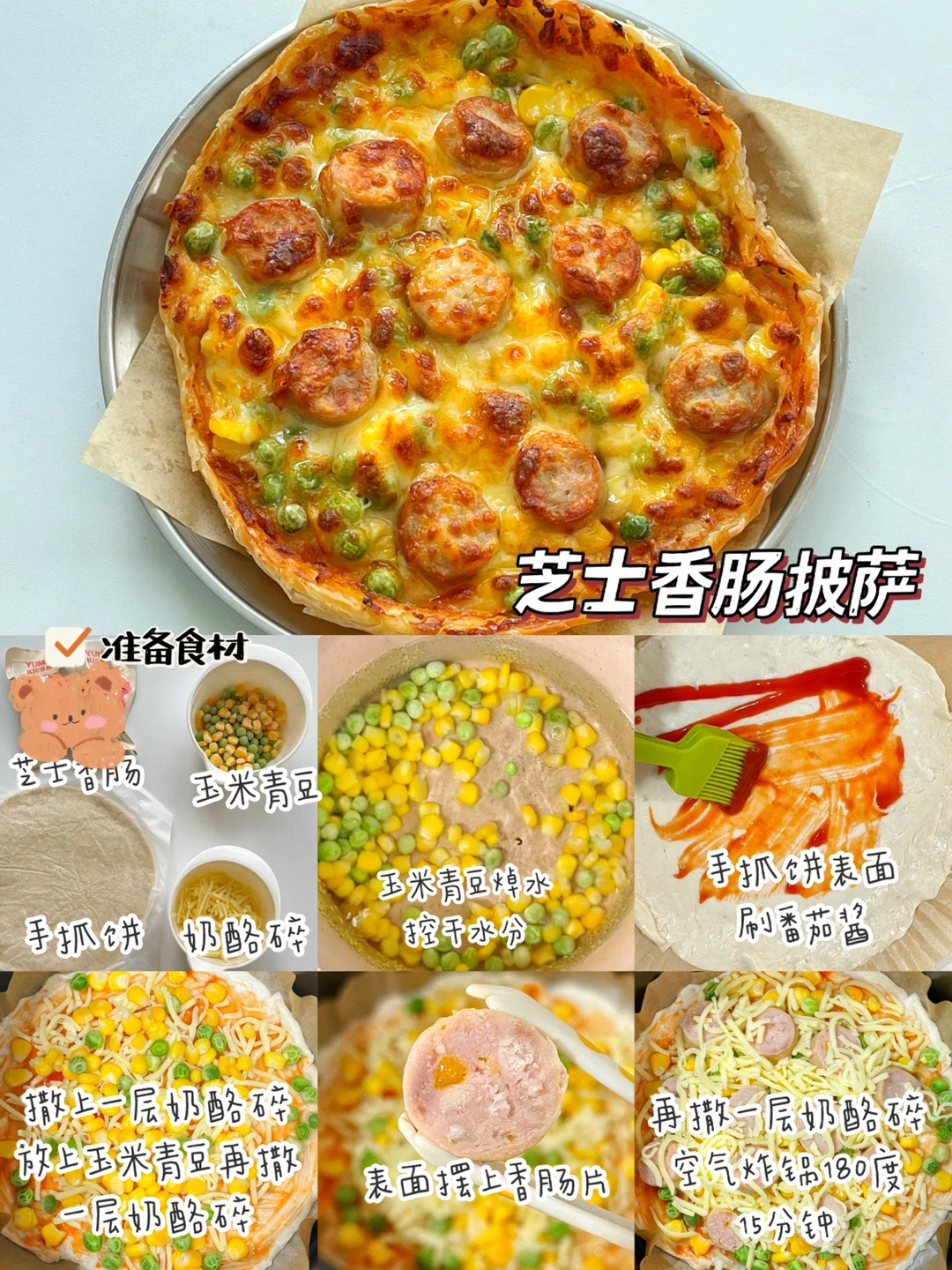 🔹制作:手抓饼表面刷上番茄酱,铺上一层芝士碎,撒上焯熟的玉米粒和青豆(要控干水分)再撒上一层芝士碎,表面摆上香肠片,再撒一层芝士碎, 180度15分钟即可。