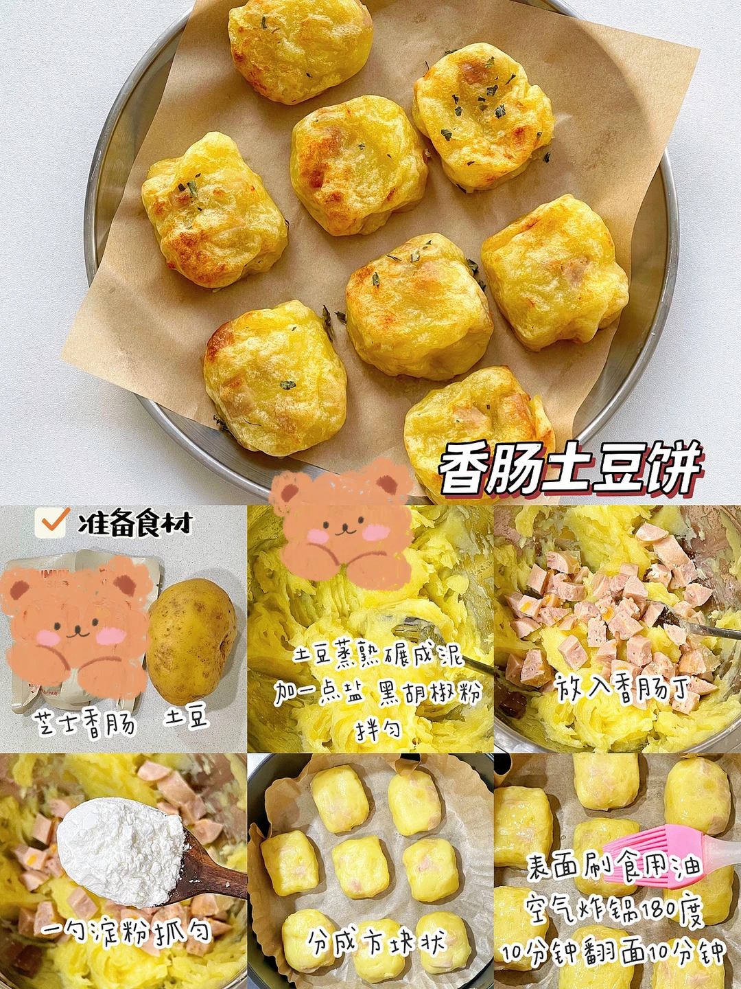 🔹制作:土豆蒸熟按压成泥,放适量盐+胡椒粉,放入香肠丁和一勺淀粉拌匀。捏成长方形,表面刷油,空气炸锅180度10分钟再翻面180度10分钟。