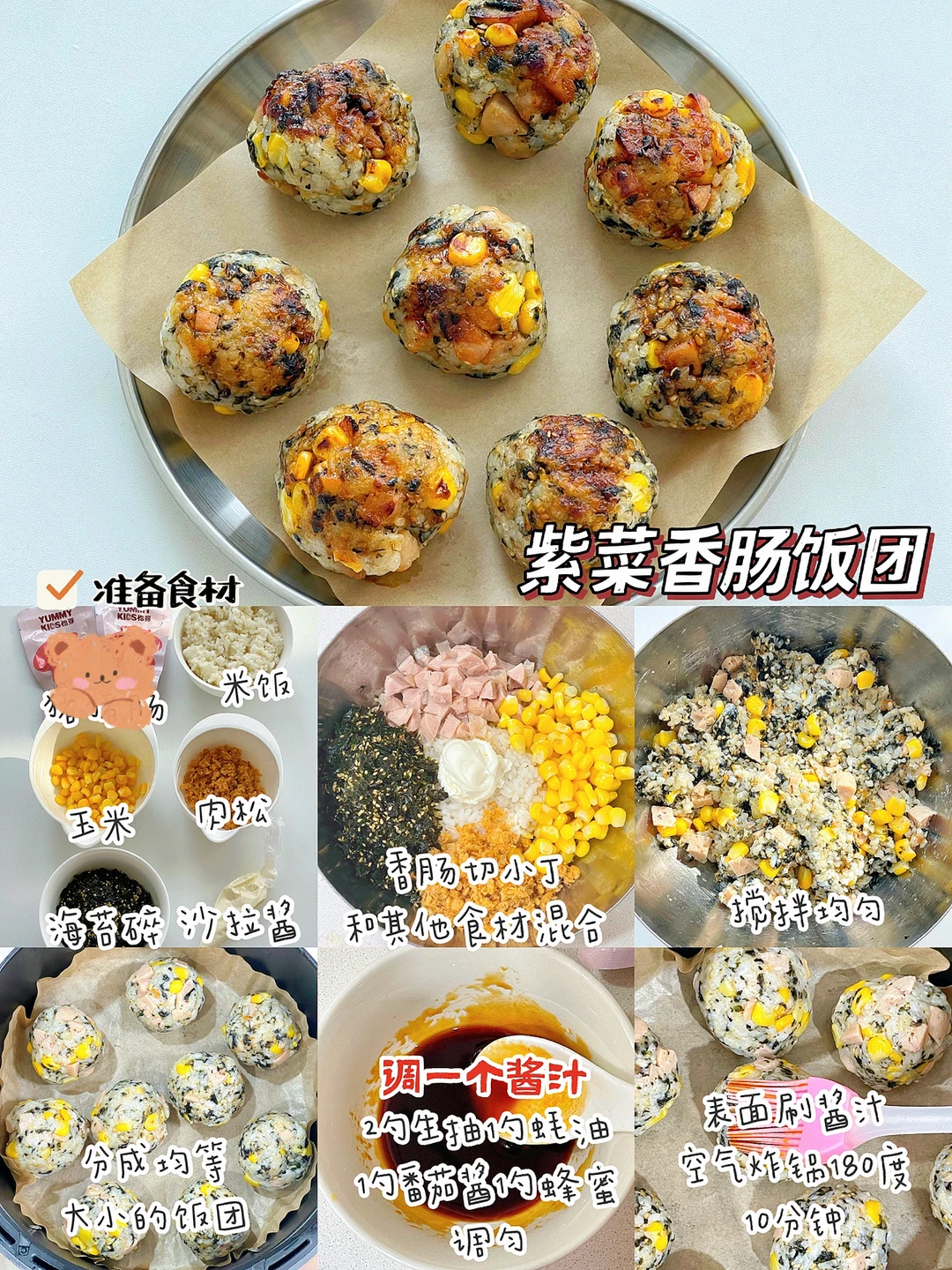 🔹制作:玉米炒熟控干水分。调一个酱汁,2勺生抽+1勺蚝油+一勺番茄酱+一勺蜂蜜搅匀。 米饭+玉米粒+香肠+肉松+海苔碎+沙拉酱混合,依次揉成均等大小的饭团。放入空气炸锅,表面刷酱汁,·180度10分钟即可。
