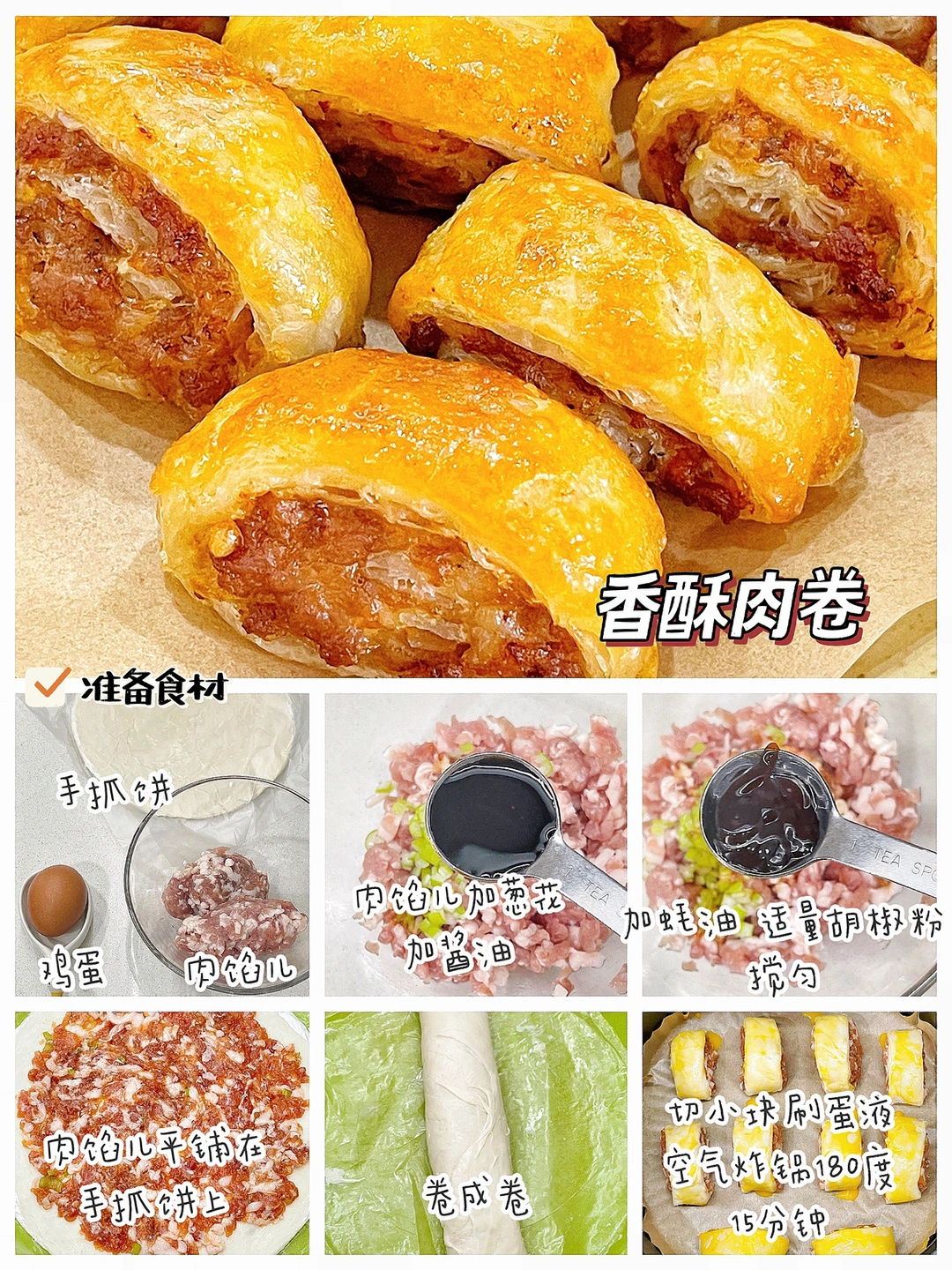 🔹制作:肉馅儿加入适量葱花,2勺生抽、1勺蚝油、适量胡椒粉顺时针搅拌均匀。把调好的肉馅儿铺在手抓饼上,卷成卷切成均等大小,表面刷蛋黄液,空气炸锅180度15分钟