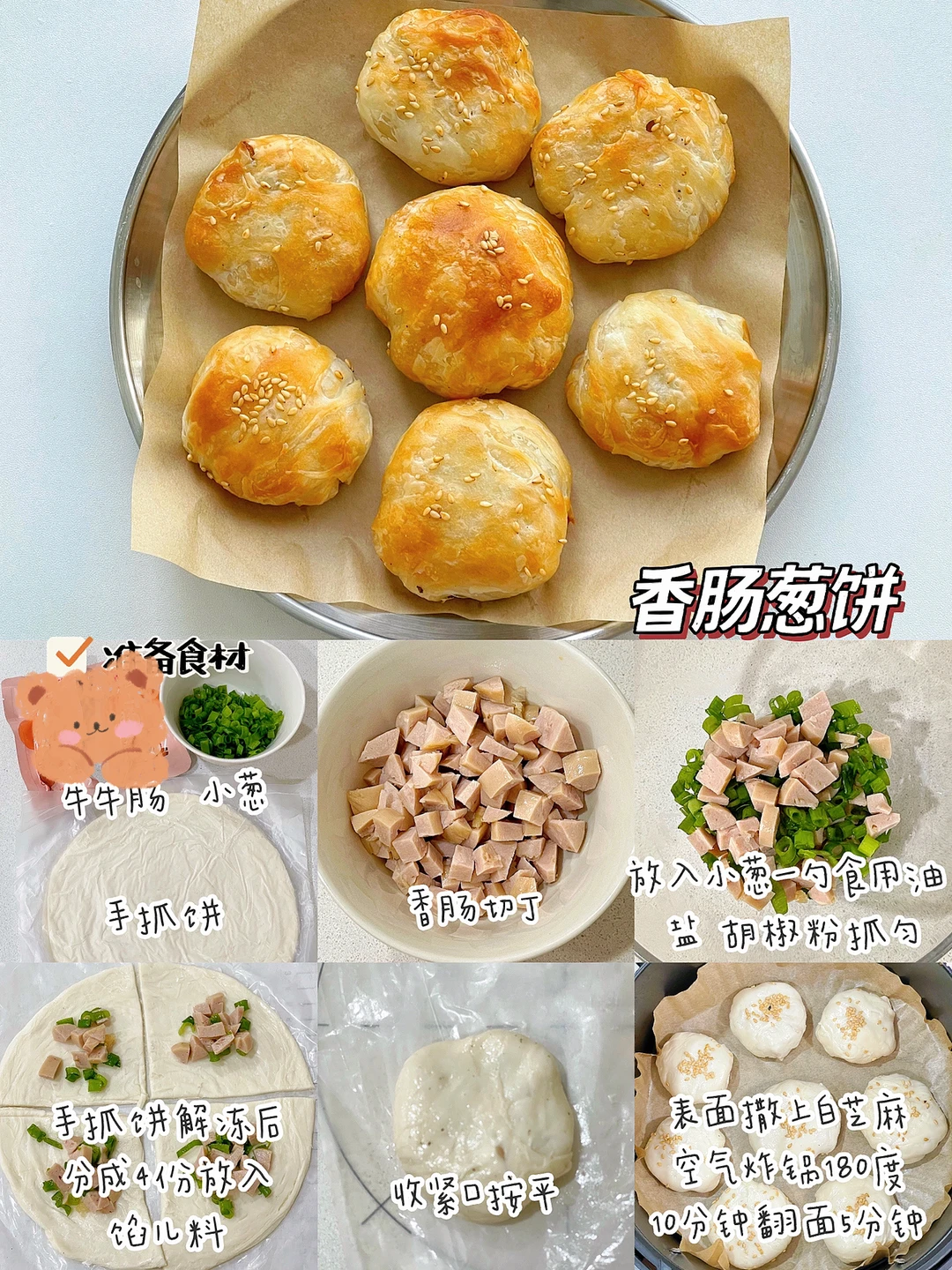 🔹制作:香肠+小葱混合,加一勺油、少许盐,一点胡椒粉拌匀。手抓饼分成4等份,摆上馅儿料包起来压平,表面撒上白芝麻,放空气炸锅180度10分钟,再翻面5分钟。