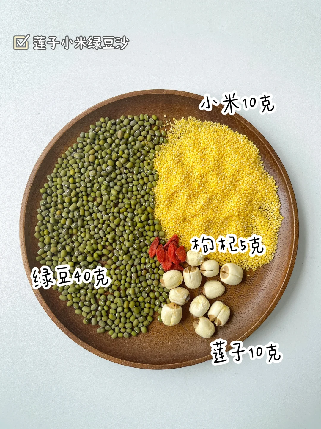 🔹绿豆40克、小米10克、莲子10克、枸杞5克,清水400毫升