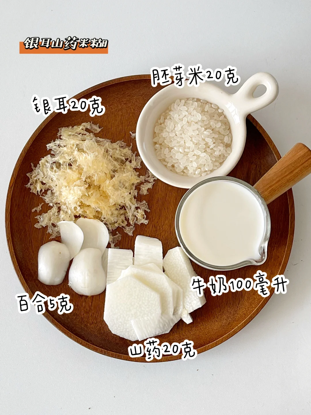 食材:银耳20克、山药20克、百合5克、胚芽米20克、牛奶100毫升、清水300毫升。