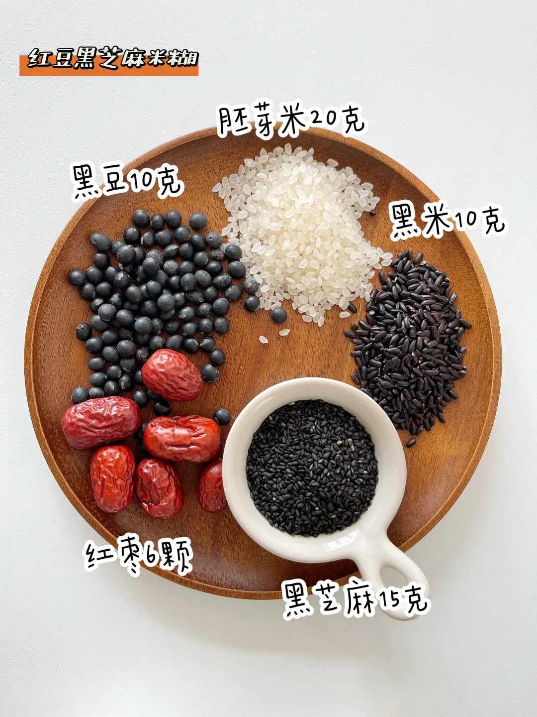 食材:黑豆10克、黑米10克、黑芝麻15克、胚芽米20克、红枣6颗,清水400毫升。