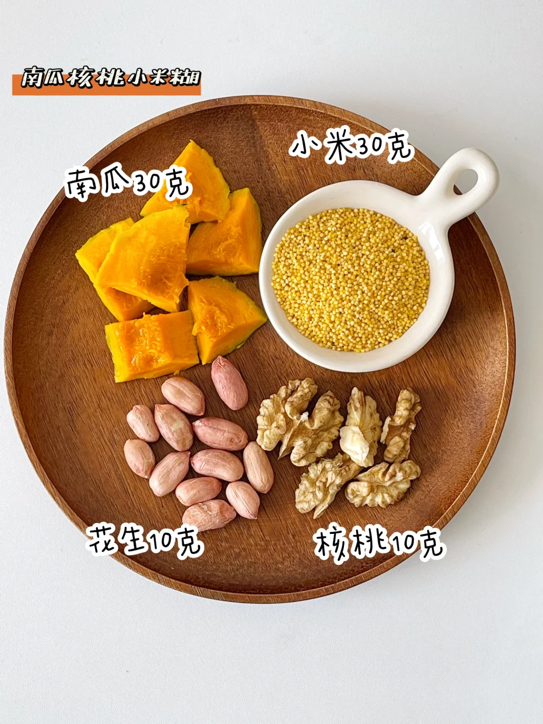 食材:南瓜30克、小米30克、花生10克、核桃10克、清水400毫升。