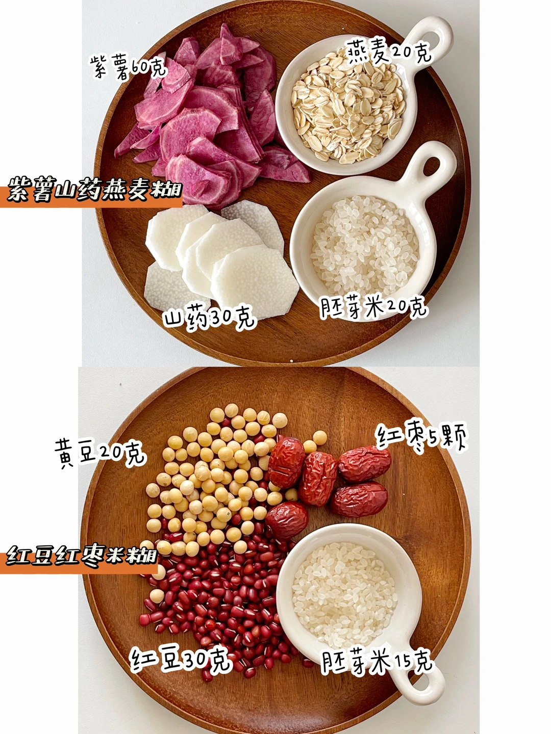 食材:紫薯60克、山药30克、燕麦20克、胚芽米20克、清水400毫升。
