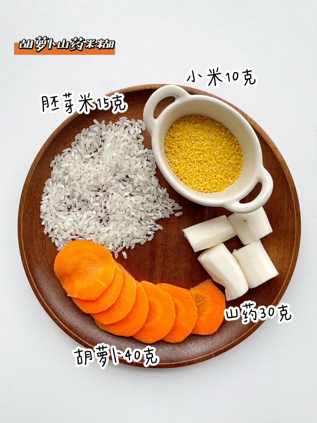 ✅胡萝卜山药米糊:胡萝卜40克、山药30克、胚芽米15克、小米10克,清水400毫升