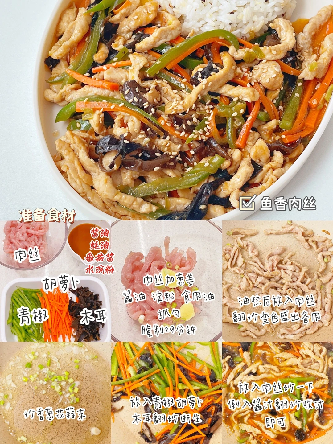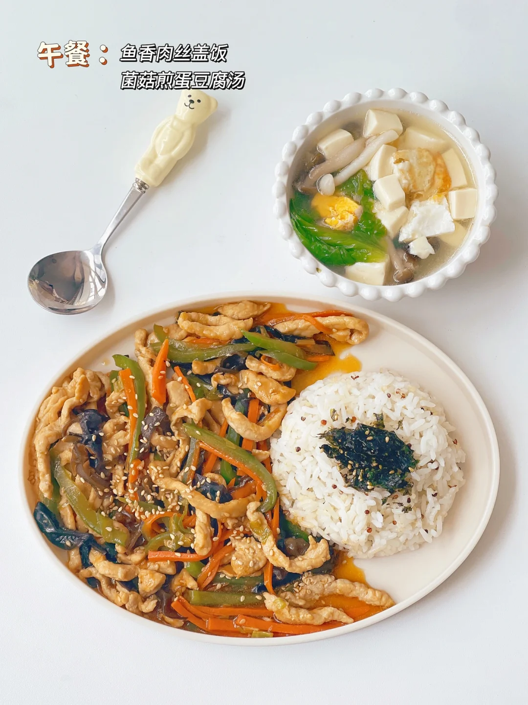 ✅午餐:鱼香肉丝盖饭、菌菇煎蛋豆腐汤