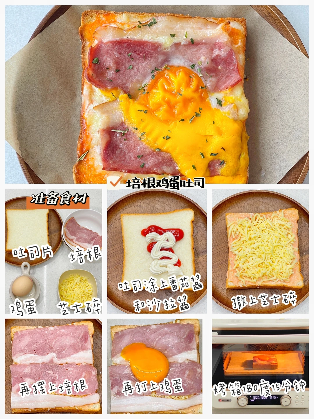 ✅制作方法:吐司片上涂上番茄酱和沙拉酱,撒上芝士碎,再放上培根,中间放上蛋黄,放入预热好的烤箱,上下管180度·15分钟。