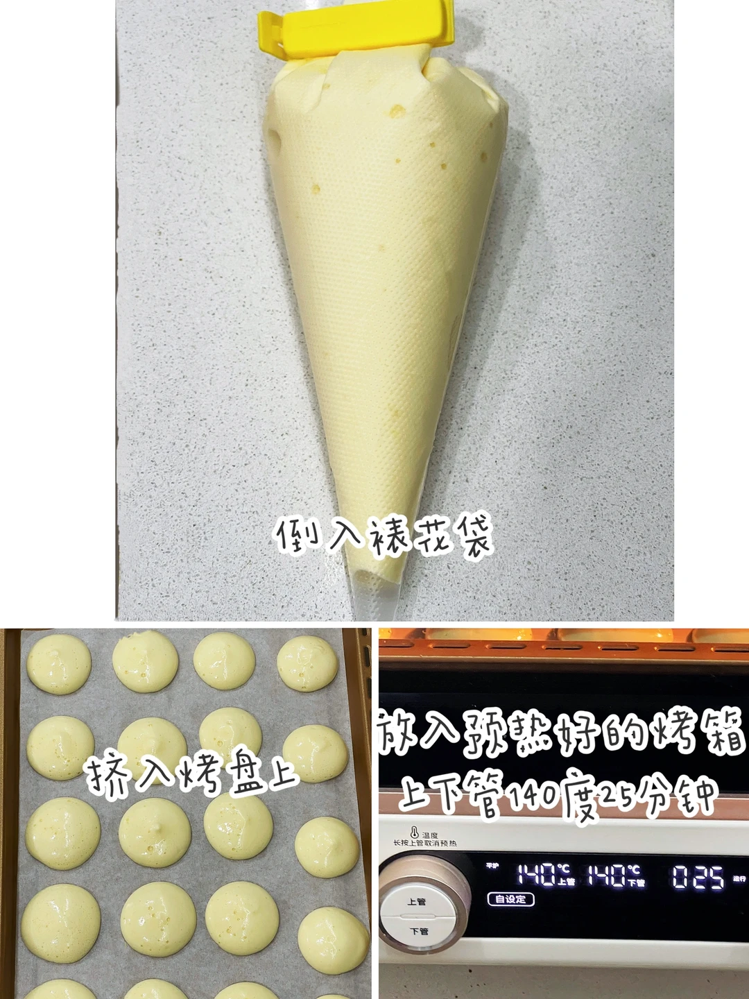 🔹倒入裱花袋。挤在烤盘上,放入预热好的烤箱,上小管140度25分钟即可。