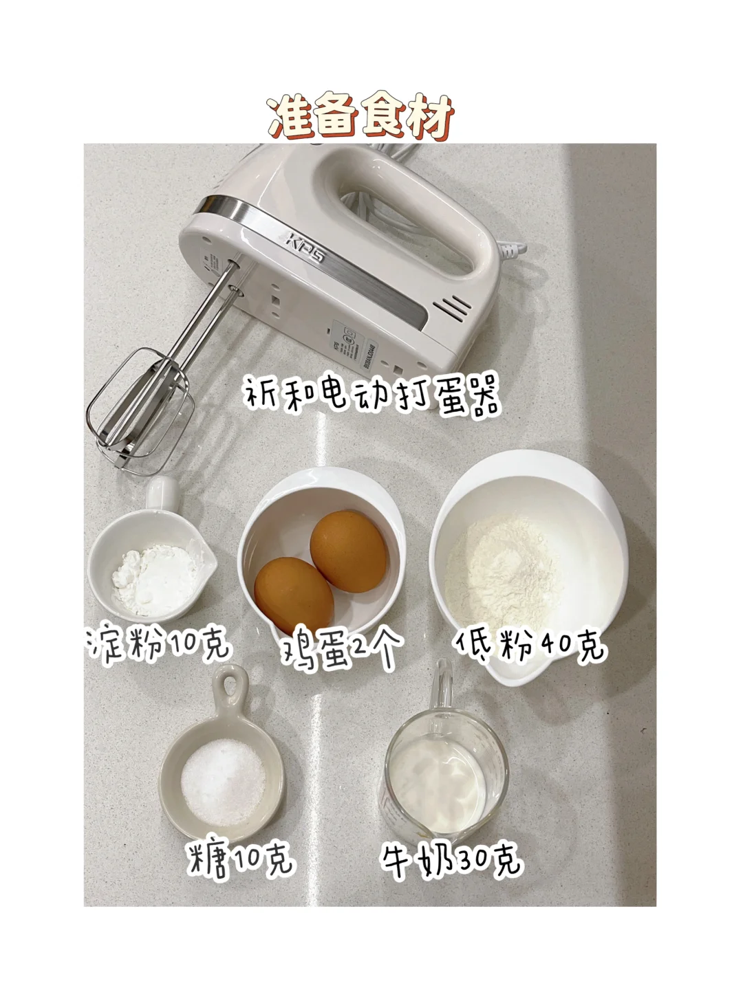 ✅准备食材:低粉40克、牛奶30克(1岁下可以配方奶)、鸡蛋2个、淀粉10克、糖10克