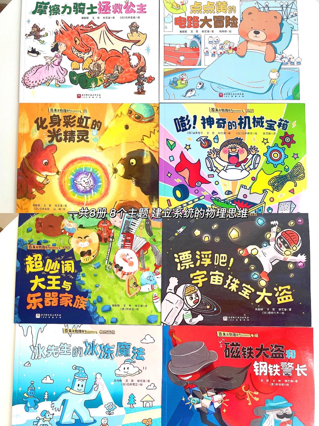 ✅《原来是物理呀》共8册,每册一个主题,分别从摩擦力、引力、三态变化、电流、声音、磁力、光、机械这些主题,通过游戏互动这种方式给孩子建立系统的物理思维,在玩中就可以了解物理知识,孩子也不会感到枯燥,接受度很高