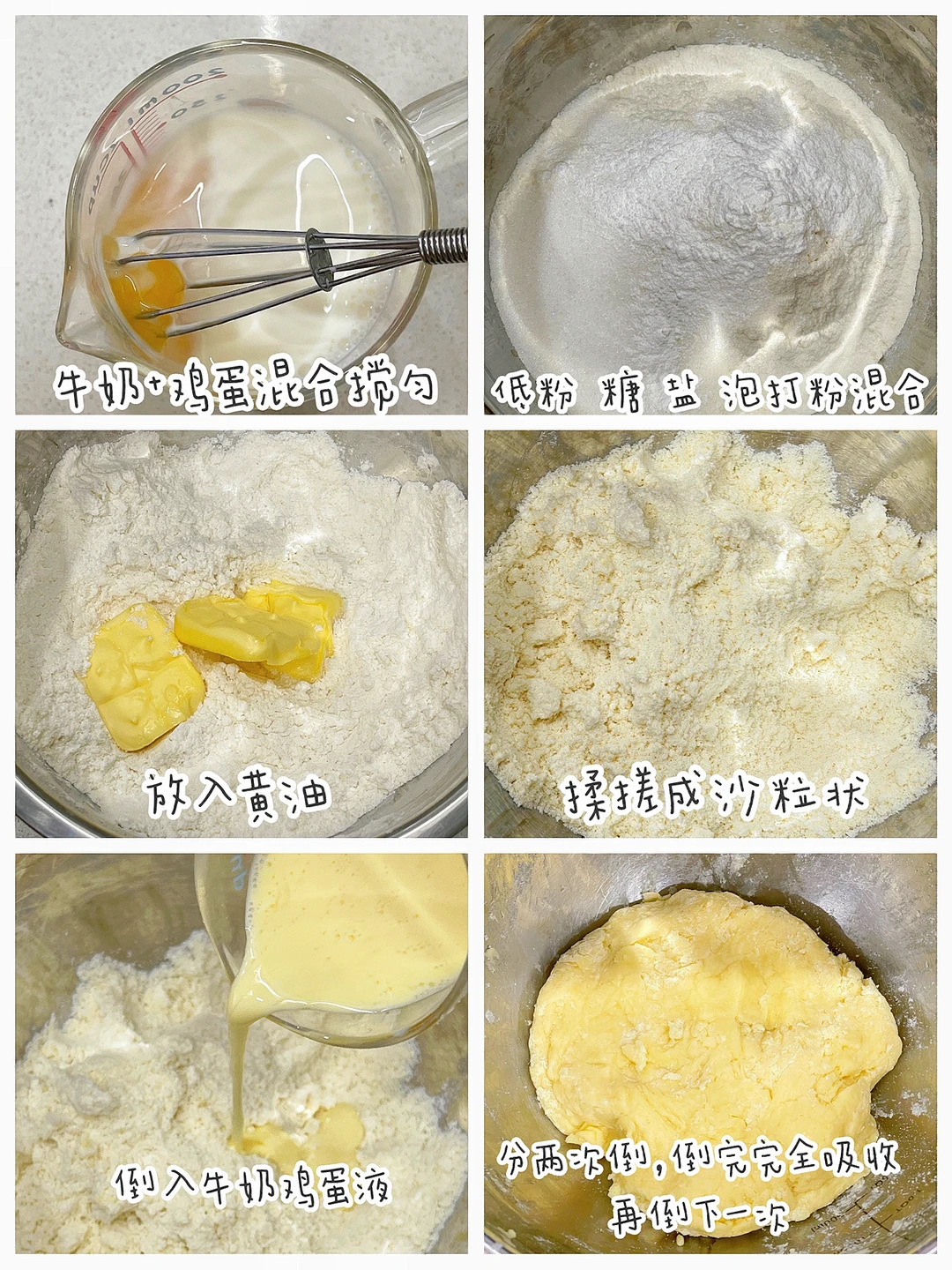 🔹低粉+糖+盐+泡打粉混合,放入黄油揉搓成沙粒状。倒入牛奶鸡蛋液,(面粉吸水性不同,不要一次倒入,只要能揉成团就可以)放入蓝莓混合成团。