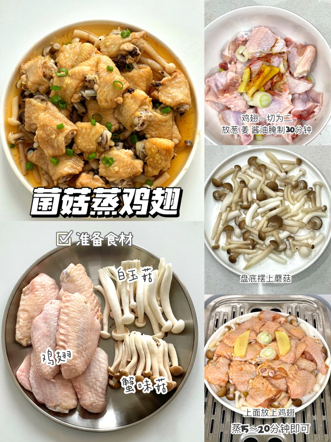 🔹做法: 鸡翅一切为二,放入葱丝姜片,一勺酱油腌制30分钟。盘子底部摆上蘑菇上面码上鸡翅,放入蒸锅蒸15分钟即可