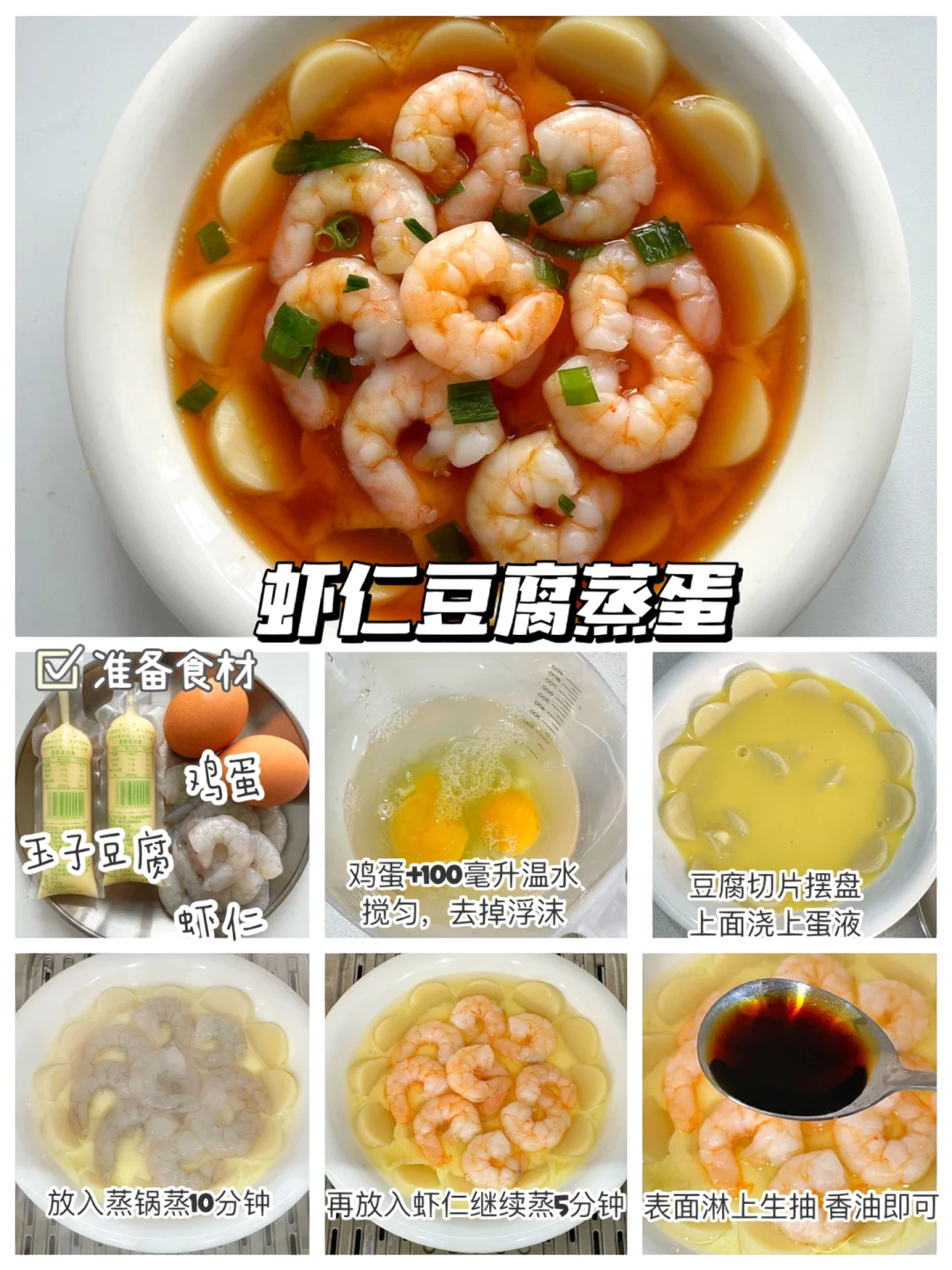 🔹做法:玉子豆腐切片摆盘中。2个鸡蛋+100毫升温水搅匀,过滤浮沫,浇在玉子豆腐表面,放入蒸锅,蒸10分钟,再放入虾仁继续蒸5分钟,表面淋上一点生抽和芝麻油即可
