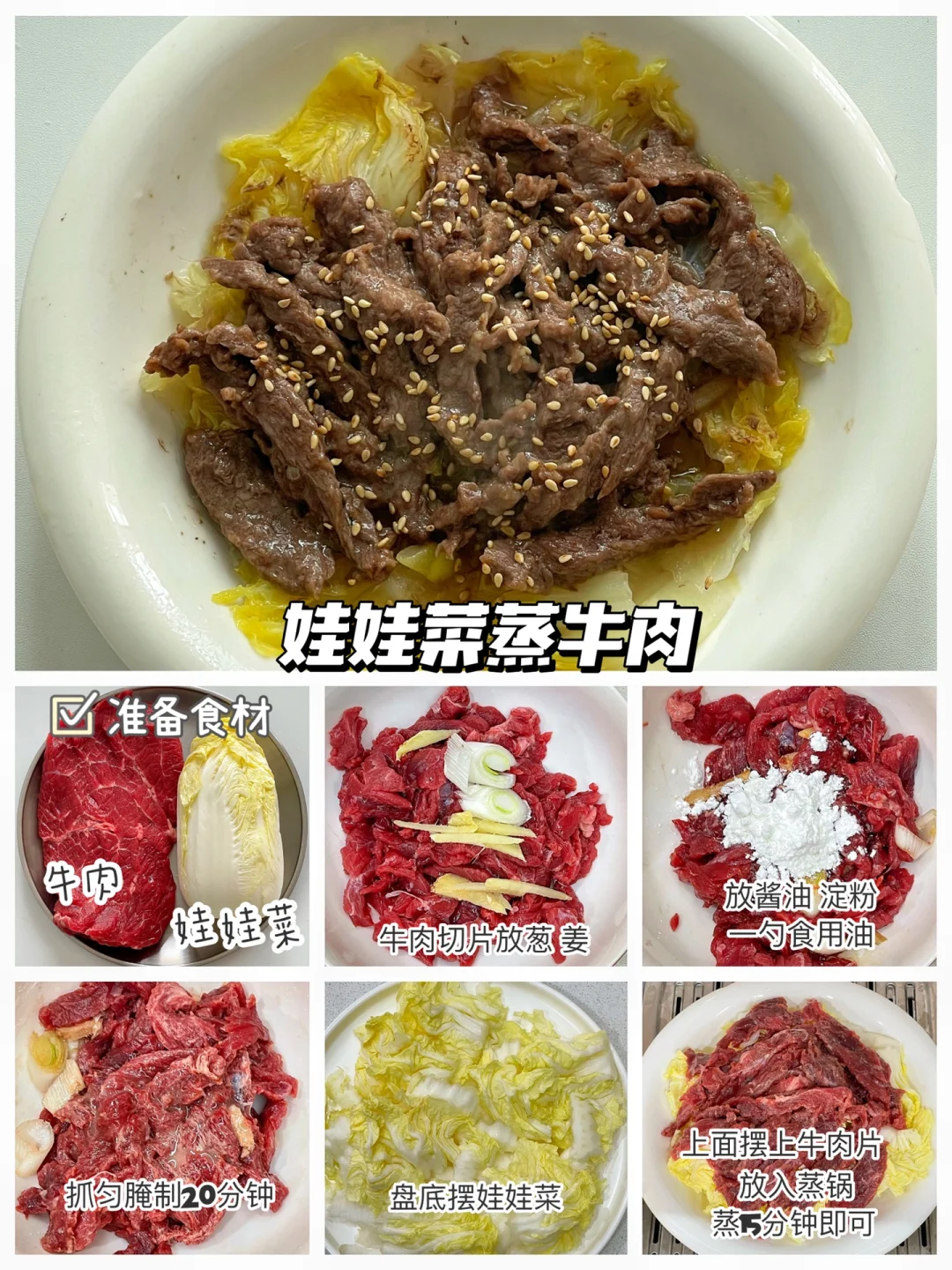 🔹做法:牛肉切薄片,放入葱、姜,一勺酱油、一勺淀粉抓匀,加一点食用油抓匀腌制20分钟。盘子摆上娃娃菜,上面摆上牛肉片,冷水上锅蒸15分钟