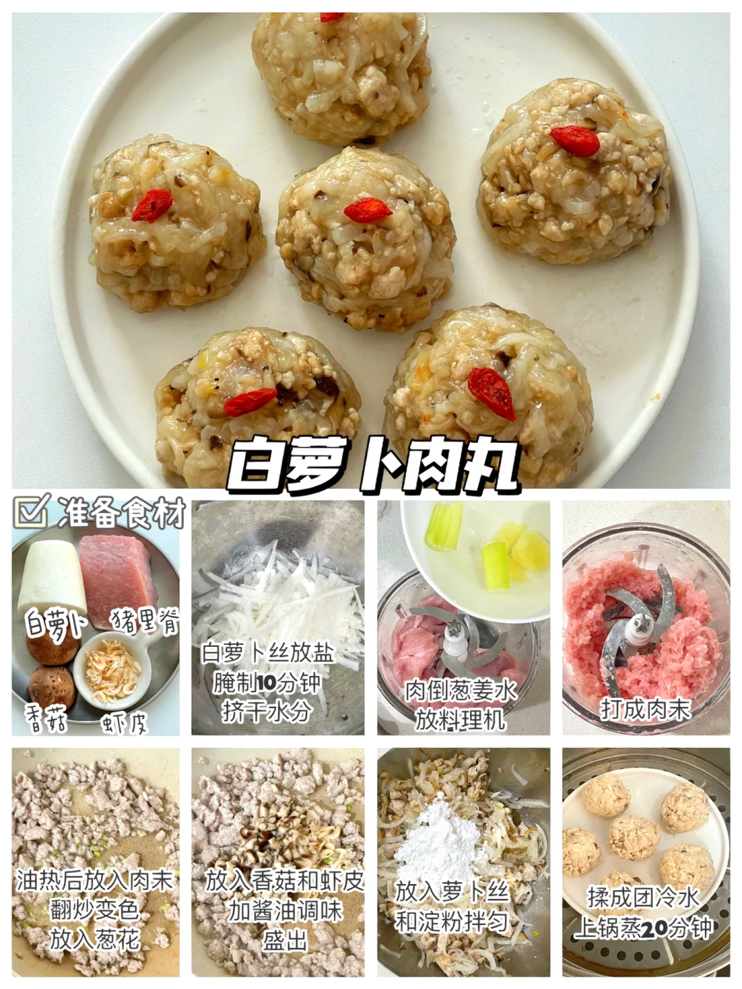 猪里脊放料理机倒入适量葱姜水打成肉末。锅里油热后放入肉末翻炒变色,放入葱花炒香,再放入香菇丁和虾皮翻炒一下,倒入酱油调味盛出。放入白萝卜丝和适量淀粉拌匀。揉成丸子冷水上锅蒸20分钟