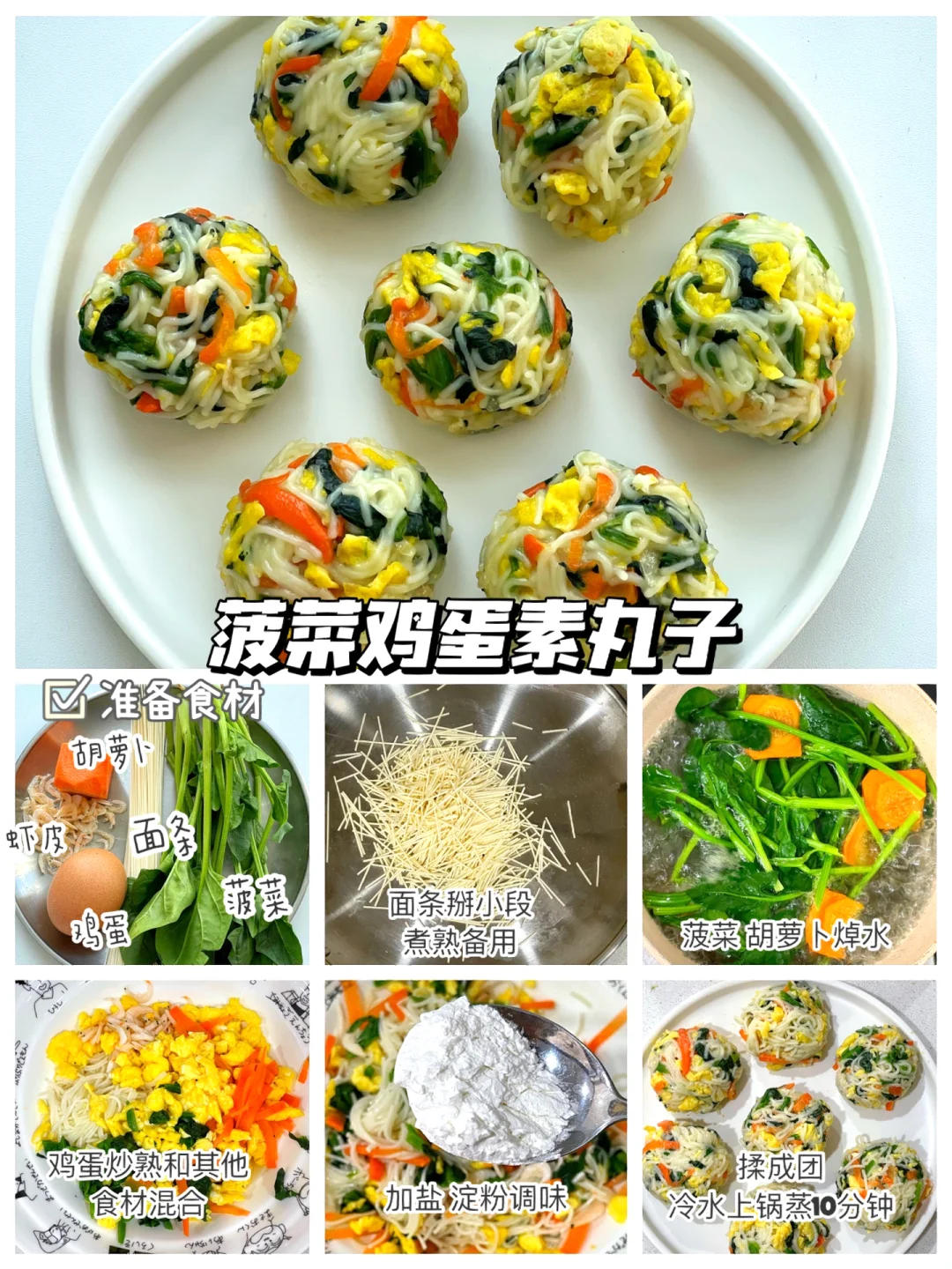 🔹做法:面条掰成小段煮熟备用。菠菜胡萝卜焯水。鸡蛋炒熟和所有食材混合,放入盐和淀粉抓匀。揉成丸子状冷水上锅蒸10分钟