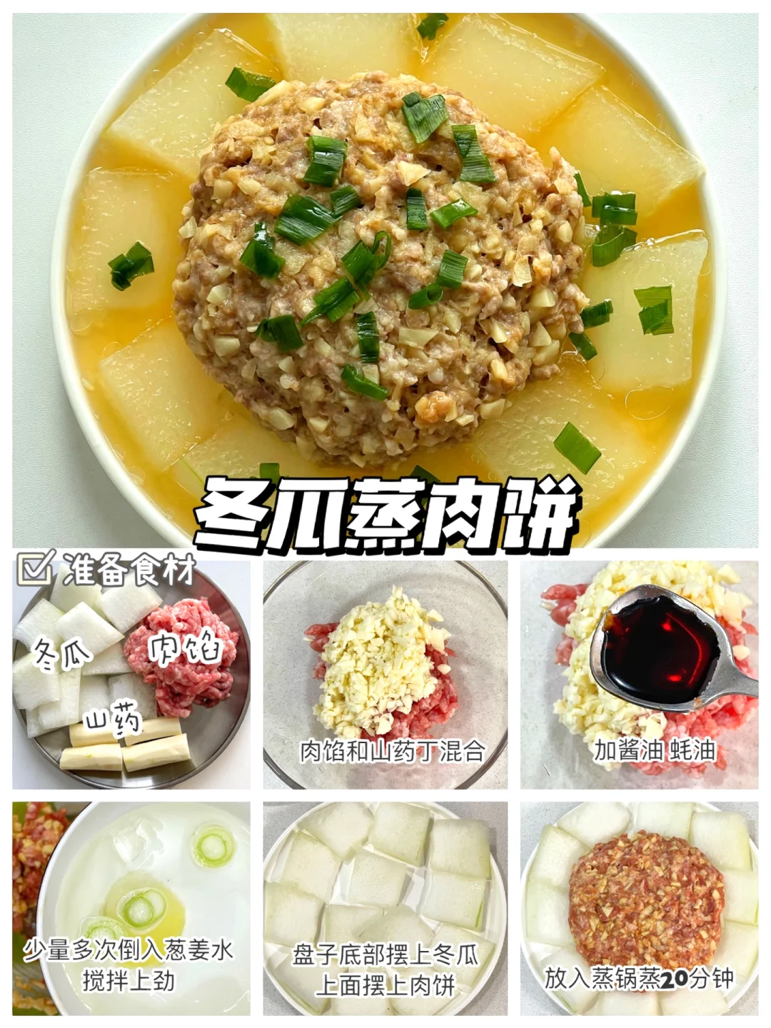 🔹做法:葱+姜片用热水冲泡30分钟放凉备用。肉馅和山药丁混合,放入一勺酱油,一勺蚝油拌匀,再少量多次倒入葱姜水,顺时针搅拌上劲。盘子底部摆上冬瓜片,中间放上腌好的肉饼,冷水上锅蒸20分钟